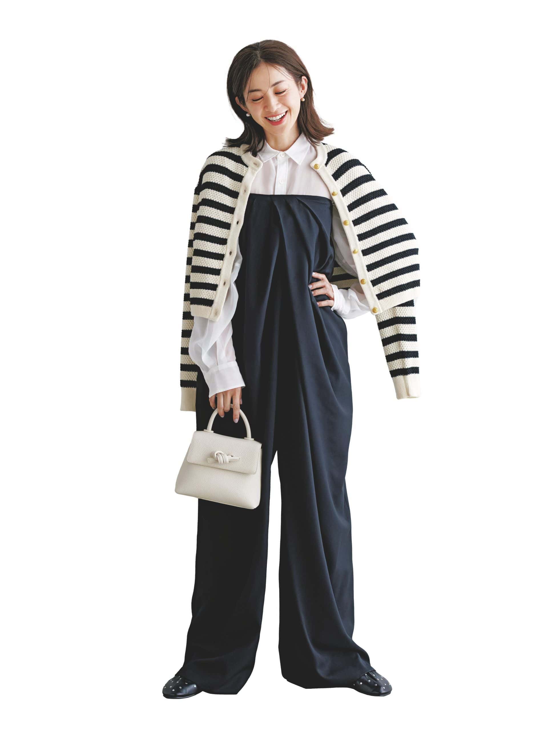 オールインワン(シーニュ)シアーシャツ¥37,400(ハイク/ボウルズ)カーディガン¥27,500〈2月発売〉(ツル バイ マリコ オイカワ)バッグ¥51,700(ヴァジック/ヴァジックジャパン)シューズ¥35,200(シーセイ/アイネックス)ピアス¥33,000(リューク)