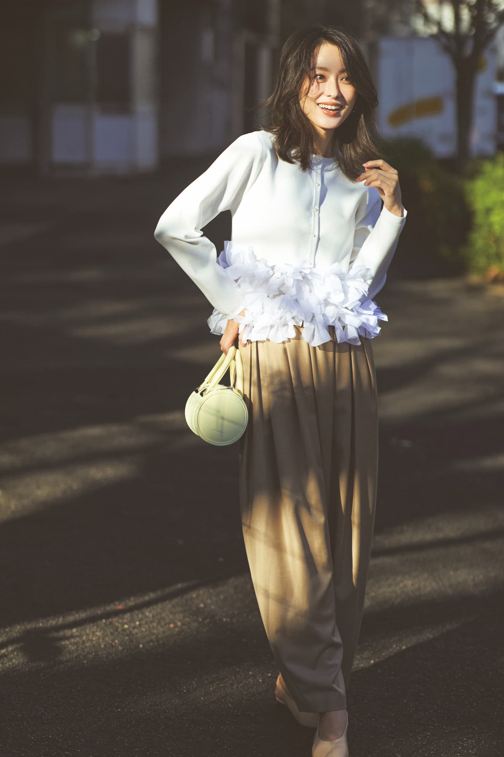 カーディガン¥20,680(ミュール)パンツ¥17,600(ノーク)バッグ¥20,900(アドカラム/アンソロジー)シューズ¥40,700(ヒューン/クルーズ ショールーム)ピアス¥104,500