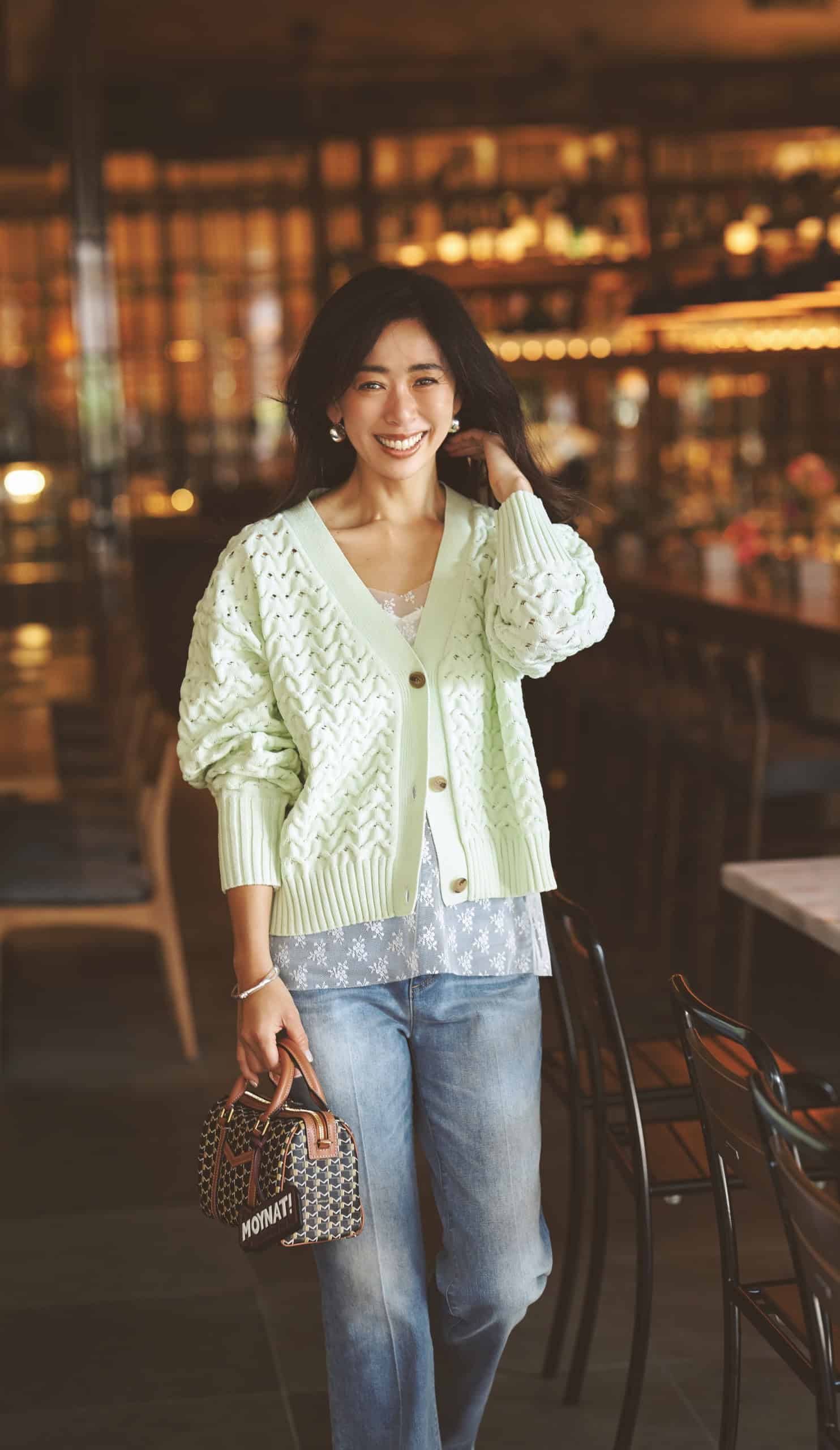 爽やかなミントカーデが、デニムスタイルを一気に春仕様に更新。レースを重ねることで抜け感と奥行きが生まれ、カジュアルに寄りすぎない軽やかな着こなしに整います。
