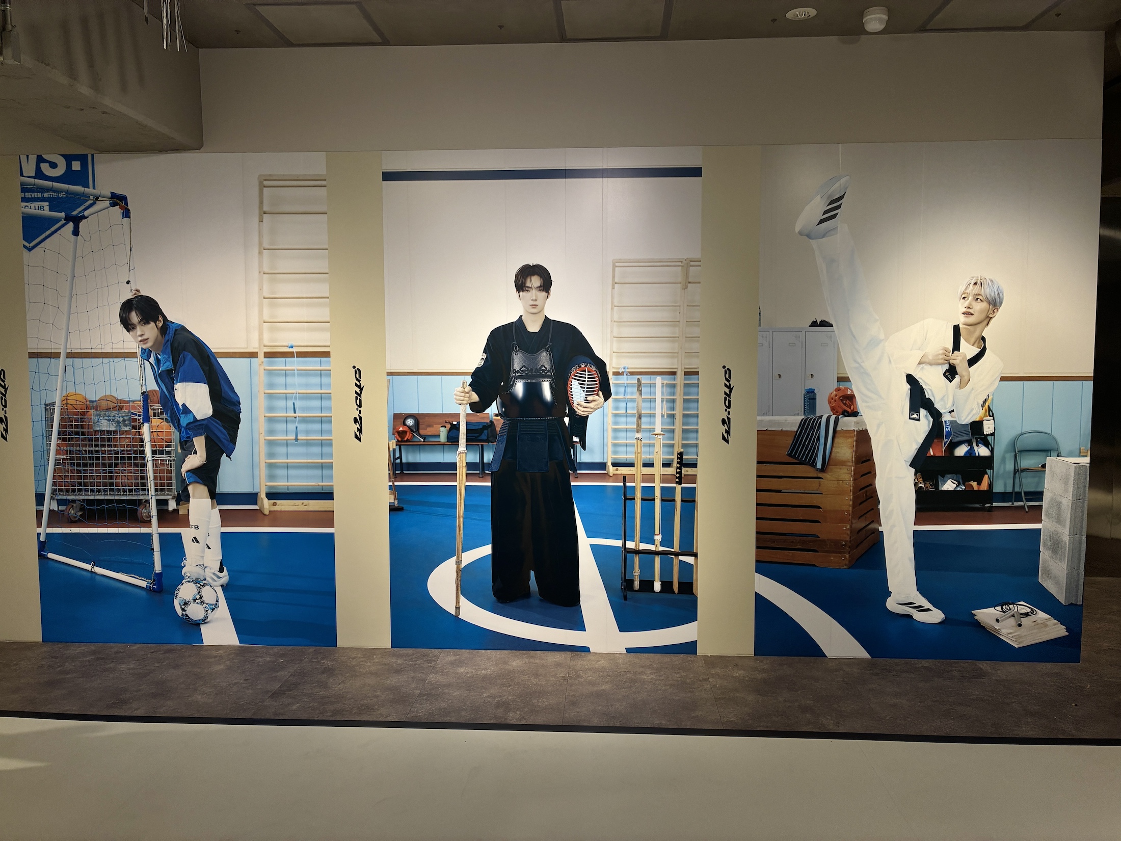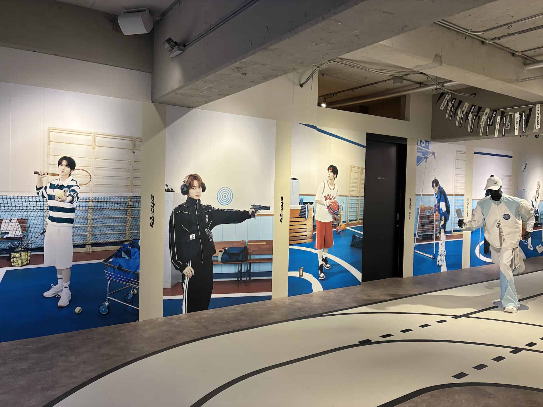 会場に入って右側の壁には様々な種目にチャレンジするメンバーの写真が掲示。SHINYUはテニス、DOHOONはサッカー、YOUNGJAEは剣道、HANJINは射撃、JIHOONはテコンドー、KYUNGMINはバスケットボールのユニフォームを着ています。