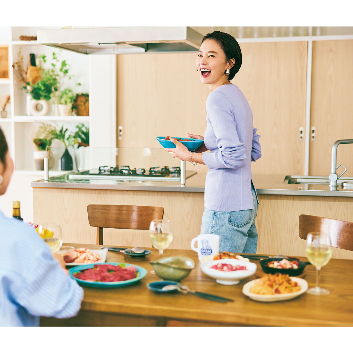 撮影で見せるクールな表情とは一変、友人からは“れいちゃん”の愛称で親しまれるれいなさん。得意料理はクレソンとカリカリベーコン入りの大人のポテサラと骨つき唐揚げ。