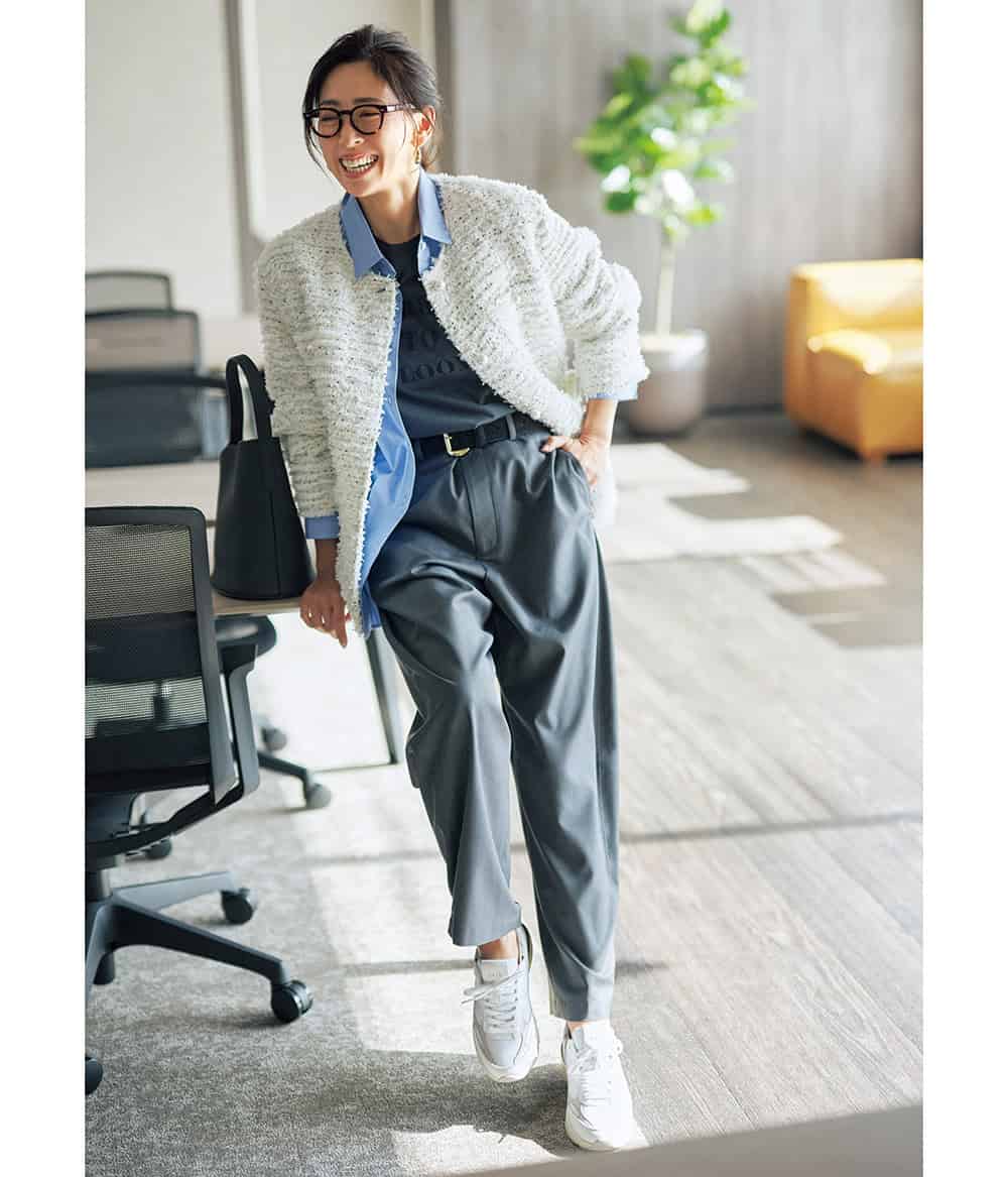 華やかなツイードジャケットは、Tシャツとシャツをレイヤードしたリラックス感のある着こなしで、親しみやすい雰囲気に。