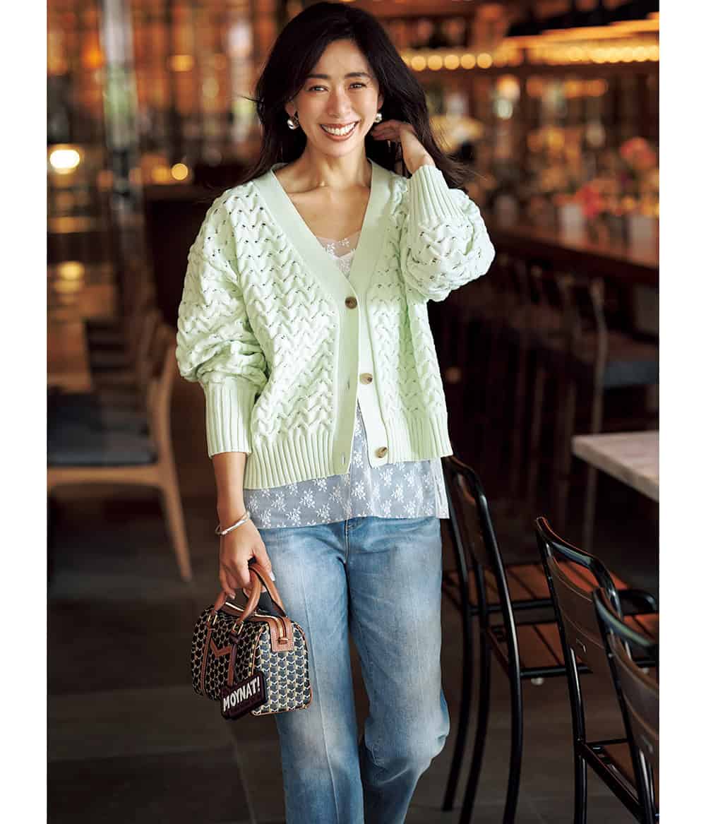 カーディガン¥29,700(スリードッツ/スリードッツ表参道店) レースキャミソール¥38,500(ユナス/エストネーション) パンツ¥19,800(ジャスグリッティー) バッグ¥272,800 バッグチャーム¥40,700(ともにモワナ/モワナ 伊勢丹新宿店)ピアス¥9,680 バングル¥11,000〈ともにピルグリム〉 リング¥30,580〈バルブス〉(すべてZUTTOHOLIC)