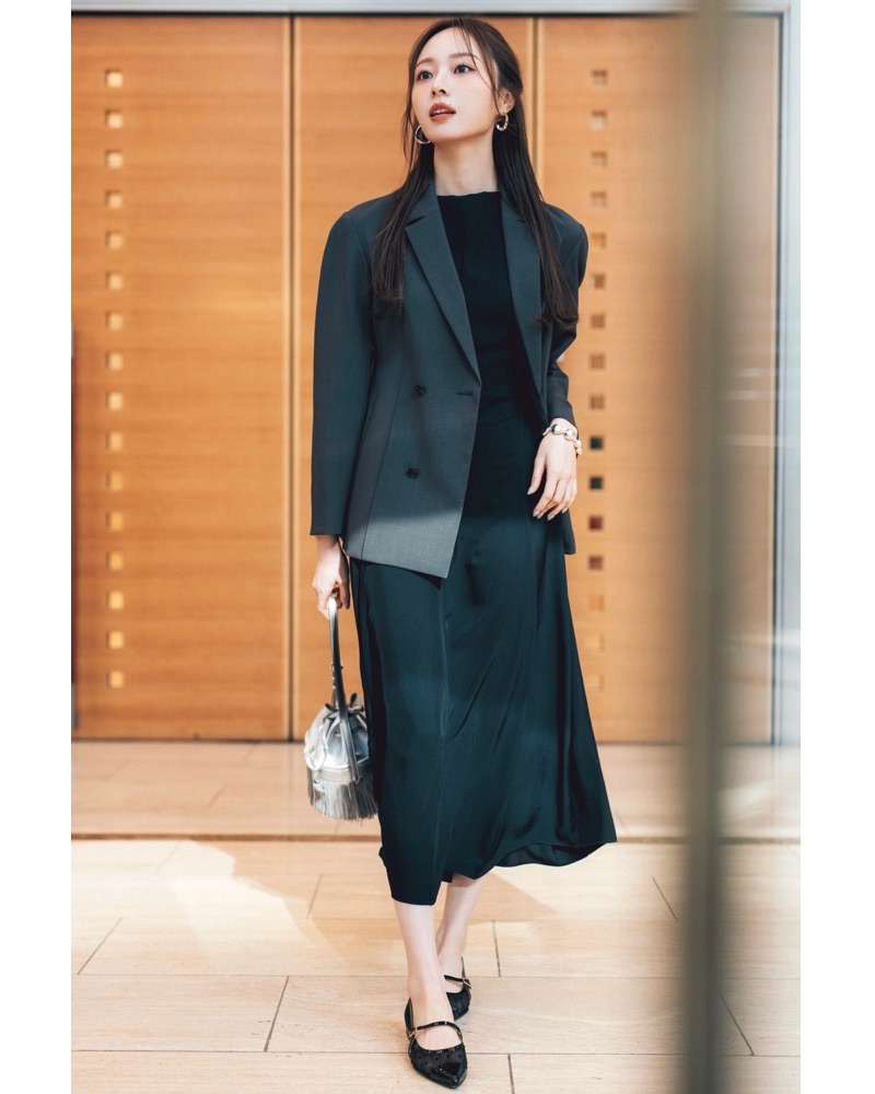 ツヤやシワ感がさり気なくモードな雰囲気を後押し。シンプルなデザインでオンオフどちらにも活躍します。