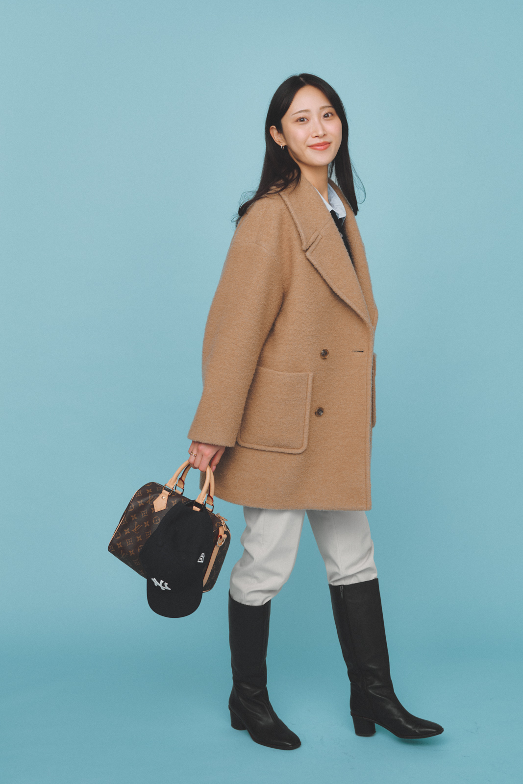 「日本よりも寒い韓国への旅行は、朝晩の冷え込み対策も兼ねたレイヤードスタイルに。気温差があるからこそ、重ねて調整できる着こなしが頼りになります。毎年人気シリーズのマカフィーのPコートは、高身長でもヒップまで隠れる丈感がお気に入り。オーバーサイズだから中に仕込みやすく、ロンTの上に羽織るだけでも春らしい印象になります。ユニクロの細身の白パンツを合わせて、軽やかさも意識しました」