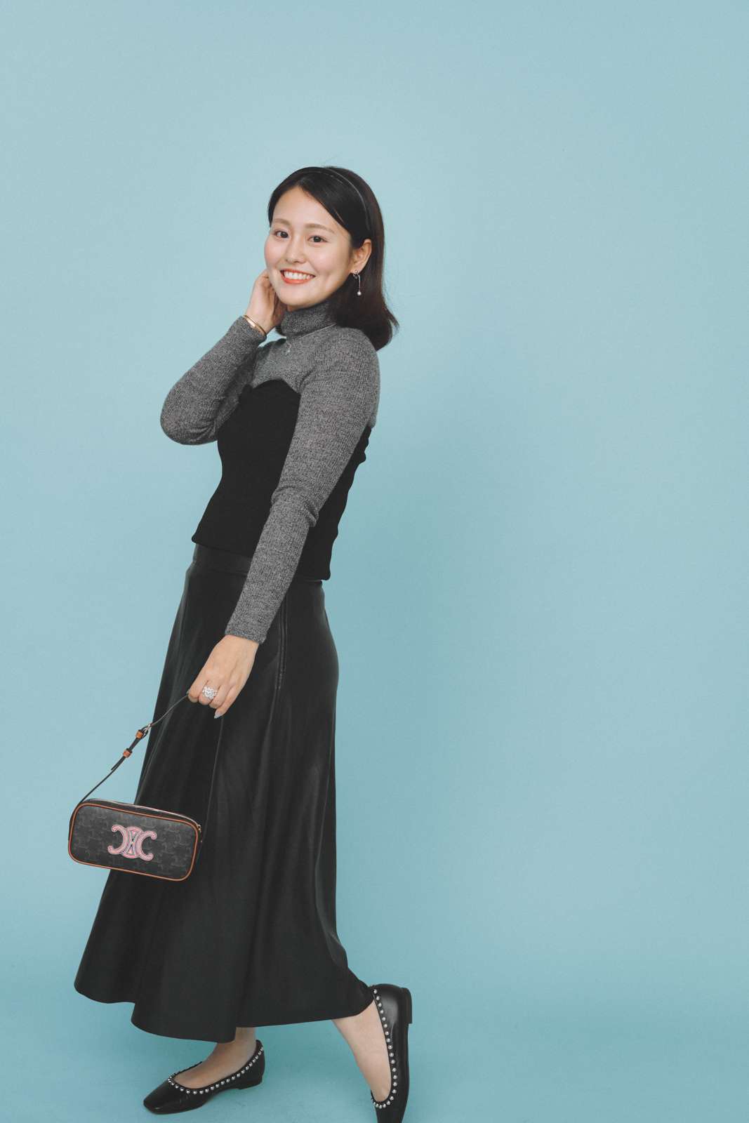 「弾丸で韓国旅へ。カフェやショッピングなど、1日中歩けるようフラットシューズで動きやすさとキレイめを両立。バナナ・リパブリックのフェイクレザーの辛口スカートで異素材ミックスにして、スカートでも甘すぎずモードな印象に仕上げました。プレゼントでいただいたセリーヌのバッグは、配色が可愛くてコーデのアクセントになります」