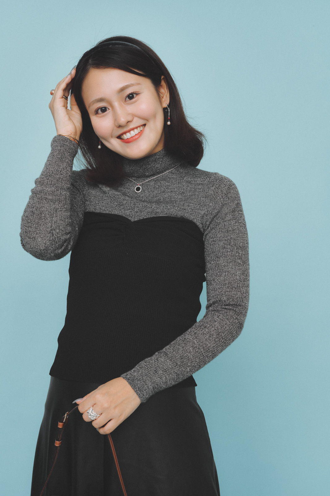 「キレイめなグレーのタートルに、黒のビスチェを一点投入するだけでトレンド感がアップ。ビスチェは一枚あると、ぐっと今っぽくなります。ロストバゲージなど、急なハプニングも多い海外旅行には、プチプラアイテムで気軽に対応するのが安心。ユニクロのタートルは伸びがよく、厚手のインナーを仕込んでも着膨れしにくいので、インナーで調整しています!」