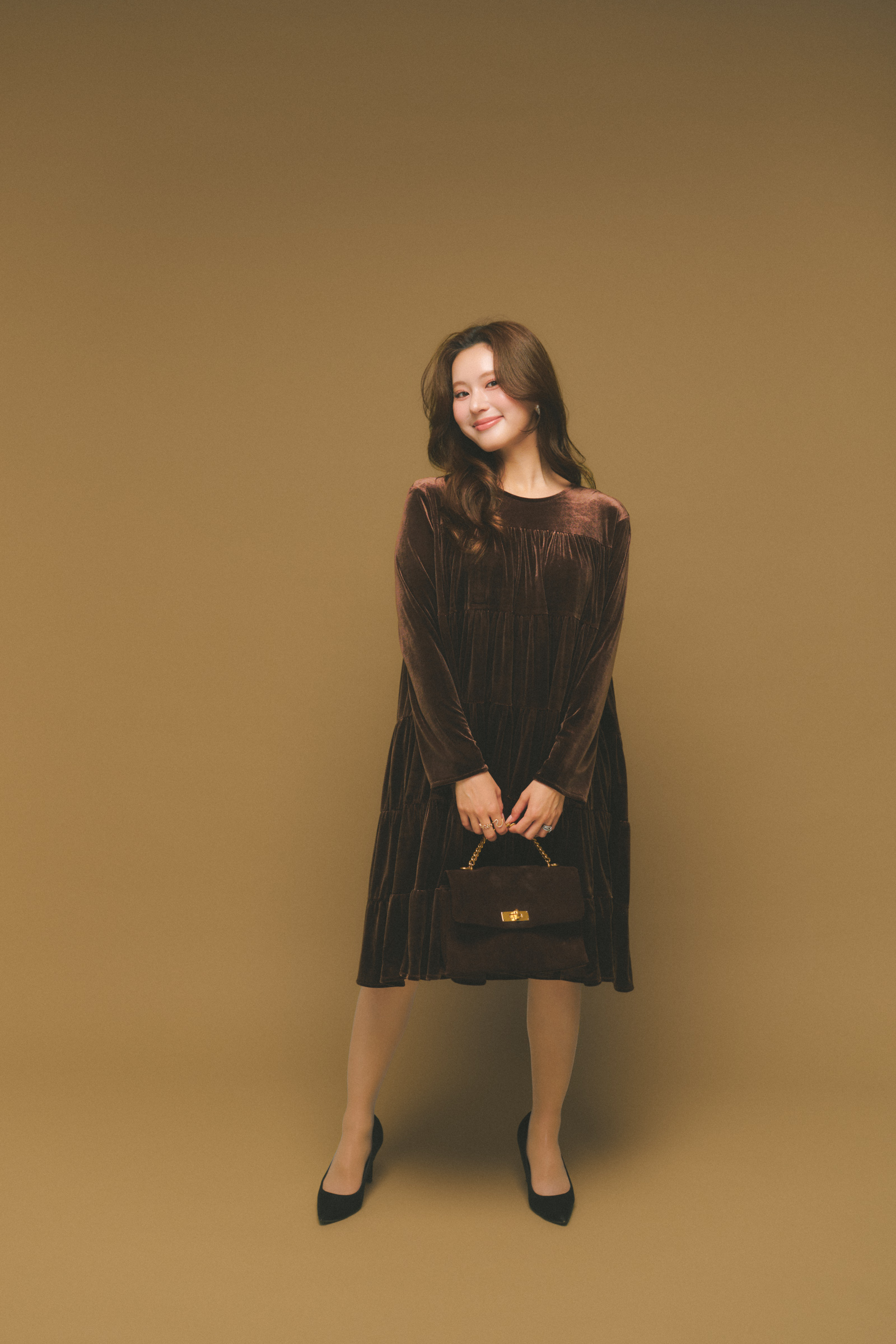 「この春ハマっているのは、異素材ミックスのコーディネート。トレフルプラスワンのベロアワンピースに、スウェードのバッグを合わせました。昨年からトレンドでもあるブラウンがマイブーム。いつも黒を選んでいましたが、ブラウンに変えるだけでコーデが新鮮に見えます。ジーユーのマシュマロパンプスは、ヒールが8.5cmとは思えないほど歩きやすく、気に入って5足目をリピート中です」
