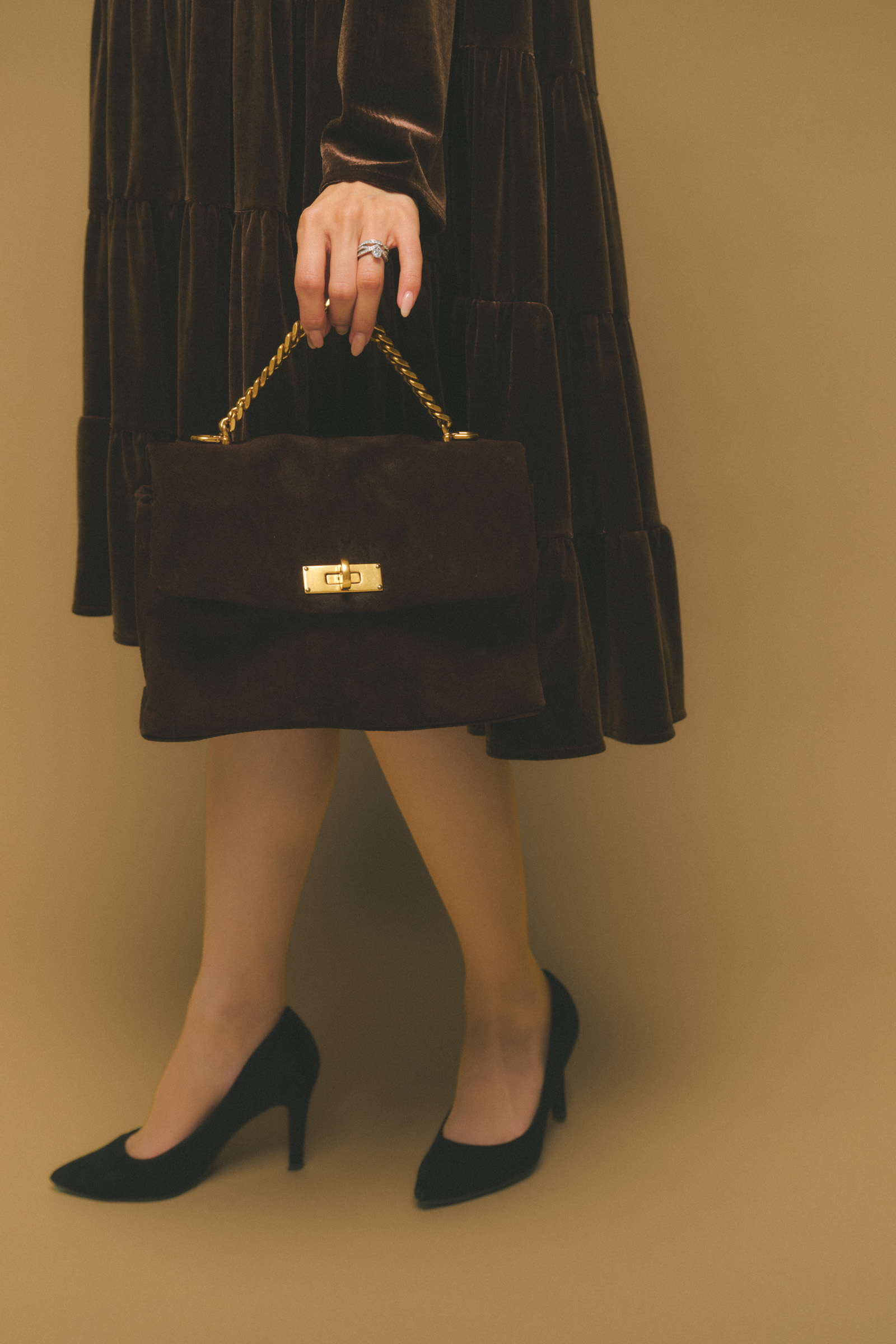「昨年、チャールズアンドキースで見つけたスウェードのミニバッグは一目惚れで購入。ゴールド金具が上品なので、オケージョンでも使えるし、デニムに合わせて休日にラフに持ってもOK。マルチシーンで使えるのも購入の決め手です。仕事の日はミニバッグ+サブバックの2個持ちが基本。仕事終わりの予定にも、洒落感があって使えるからお気に入り」