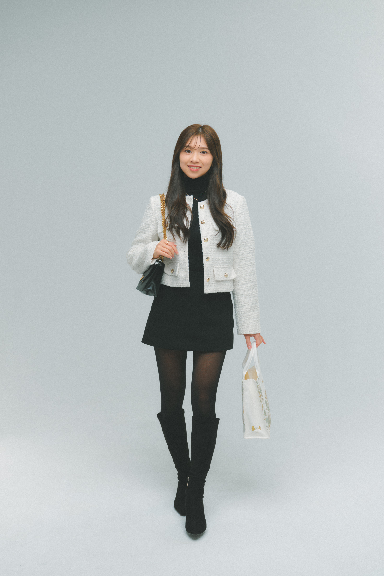 「昨年、購入したH&Mのツイードジャケットを主役にした休日の女子会コーデ。衿付きのダブルデザインできちんと感がありつつ、短丈ですっきり着られるのが気に入っています。見た目以上にゆとりがあるので中に重ねても着やすく、寒い日にも頼れる1着。モノトーンでまとめることで、ミニ丈コーデも大人っぽく仕上がります」