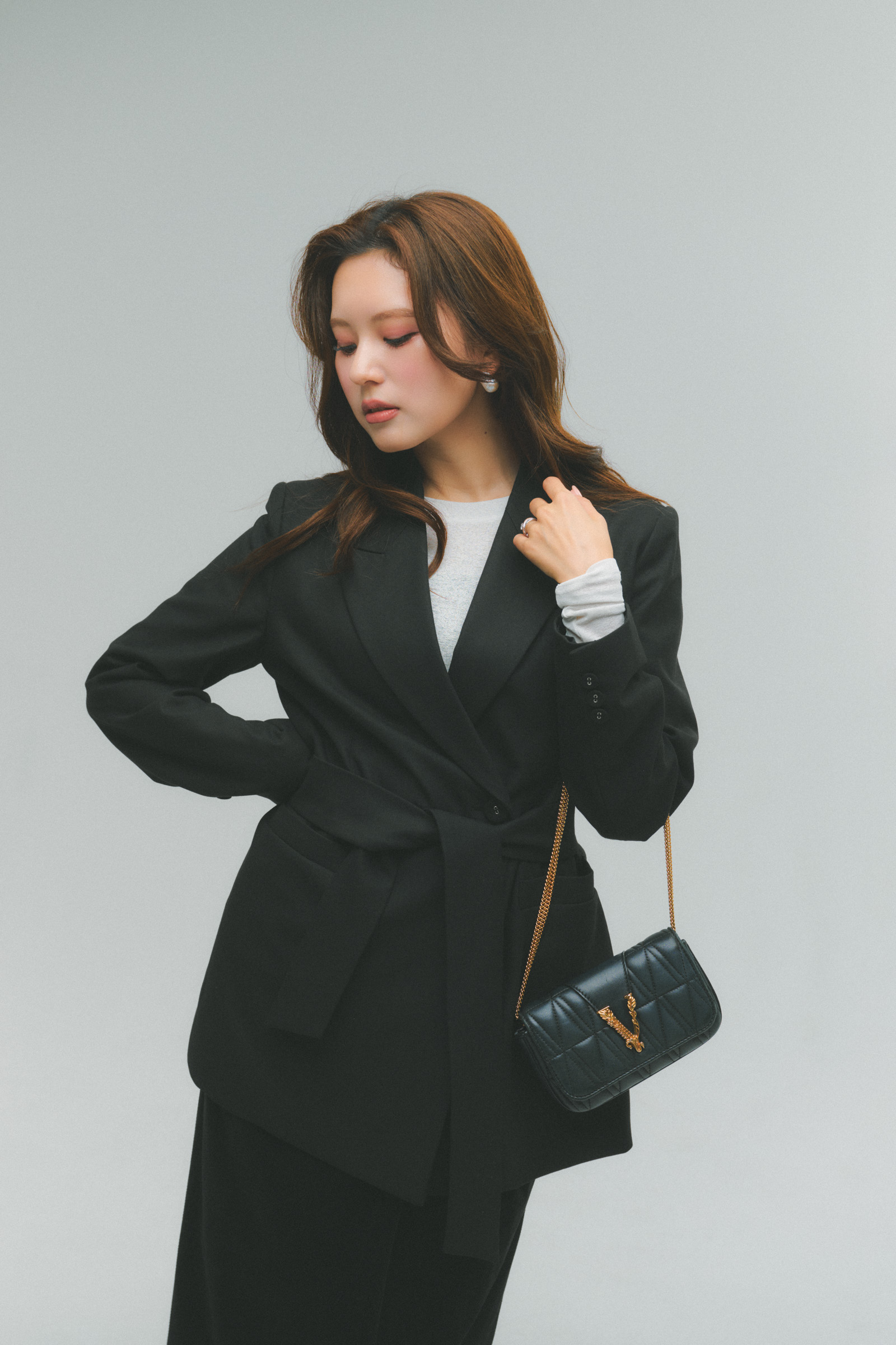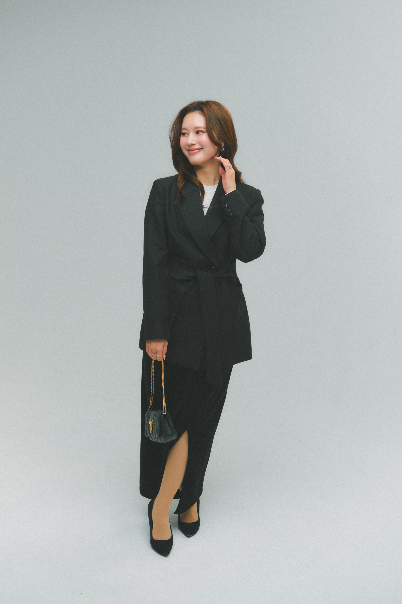 ロルのジャケットは、ベルト付きでウエストマークできるデザイン。外してさらっと着たり、その日の気分で印象を変えられるのが気に入っています。ヒップが隠れる長めの丈感でも、肩はジャストなのでバランスが取りやすいところもポイント。アレンジが効くデザインだから、着こなしの幅が広がりました」