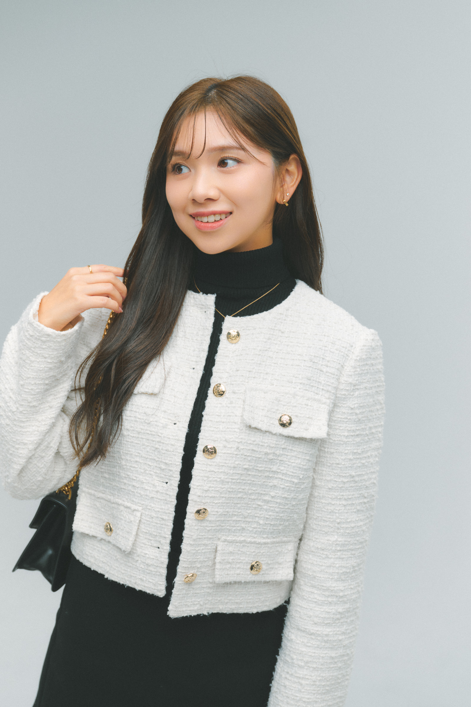ツイードジャケット×モノトーンでミニ丈を大人っぽく着こなし