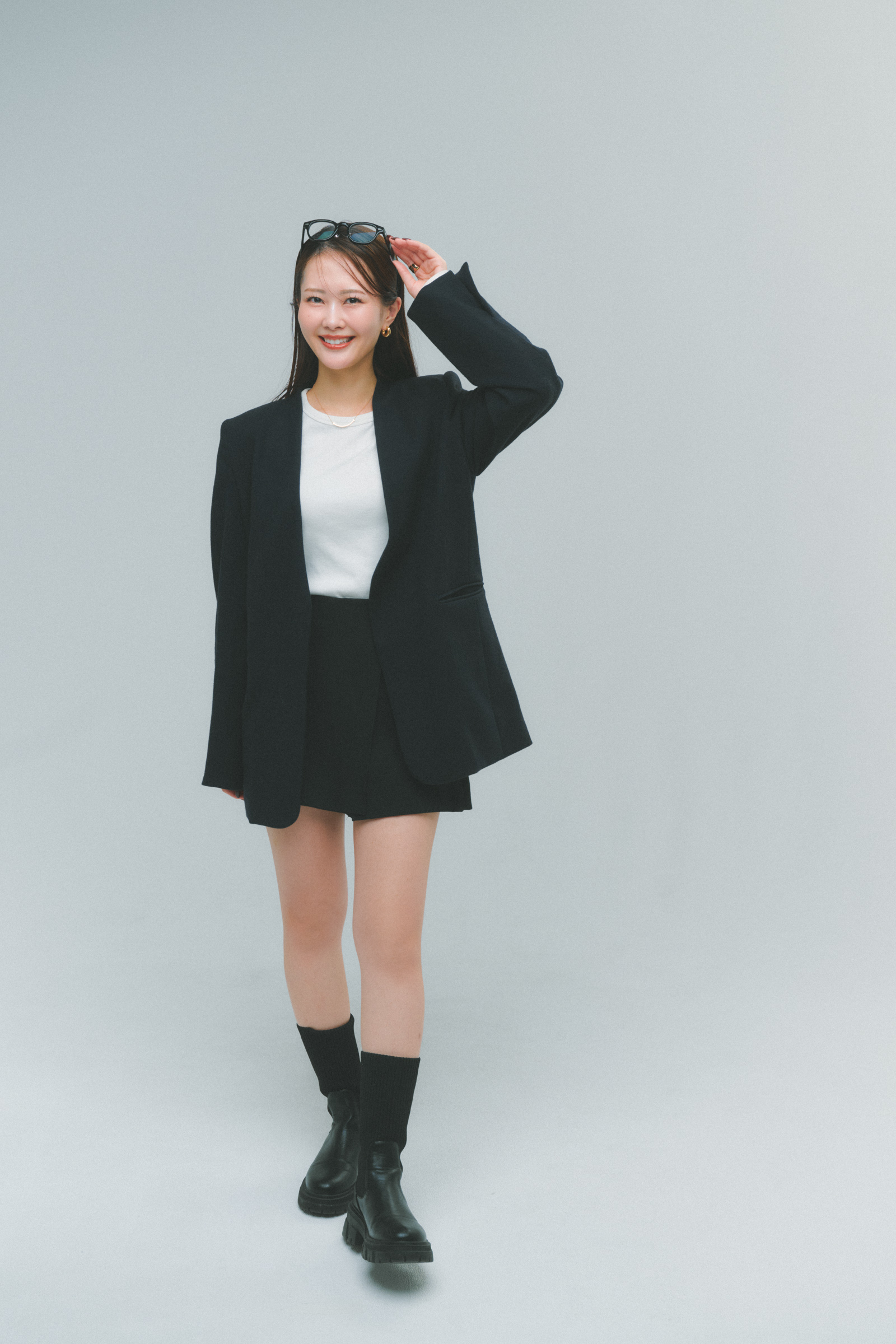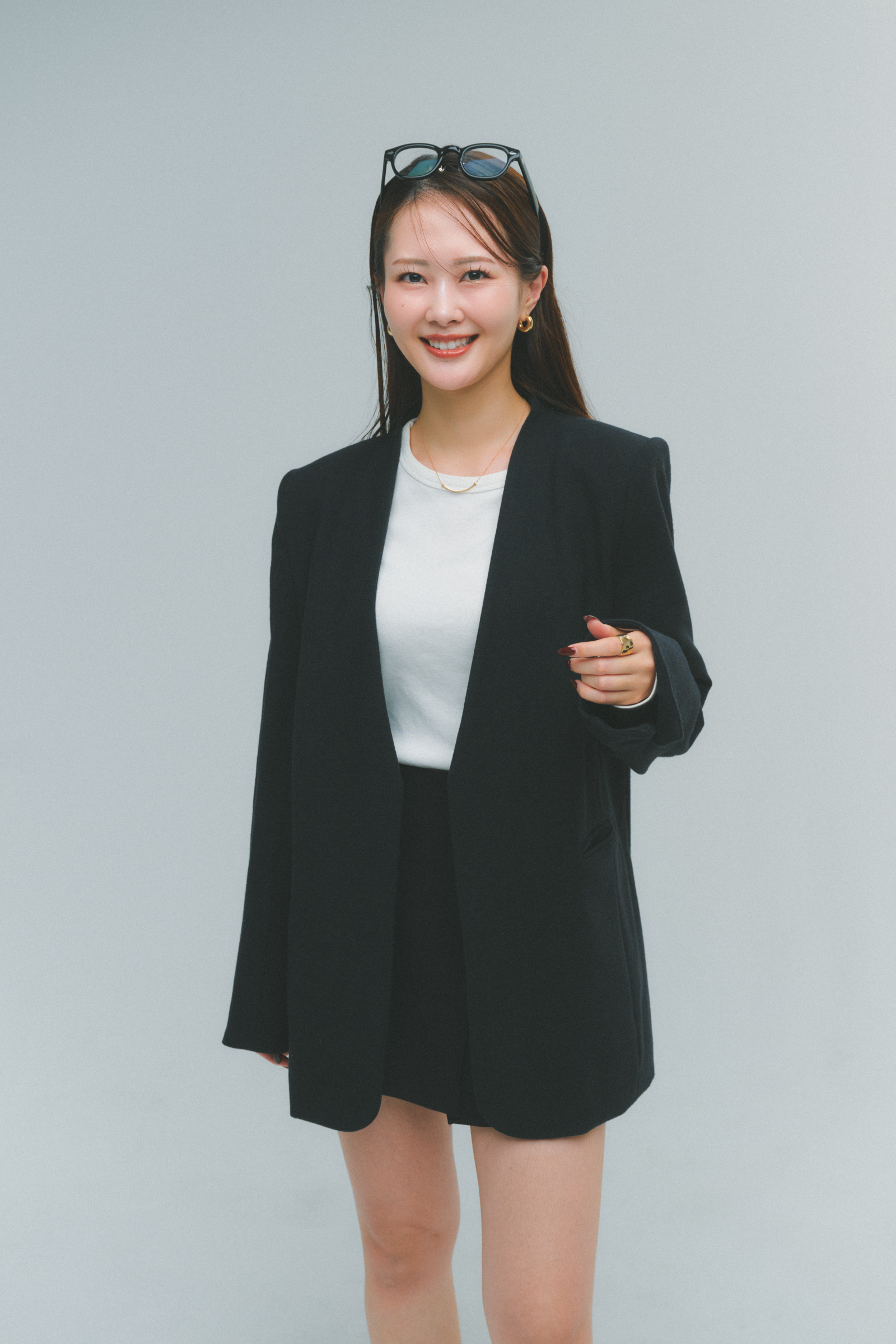 ヴェニカのジャケットは、仕事にも結婚式にも使える頼れる一着。デザイナーの佐藤涼実さんが着用しているコーデを見て一目惚れしました。長め丈のノーカラーなので、ミニ丈ボトムスとのバランスも取りやすく、シンプルながら上品な印象に仕上がります」