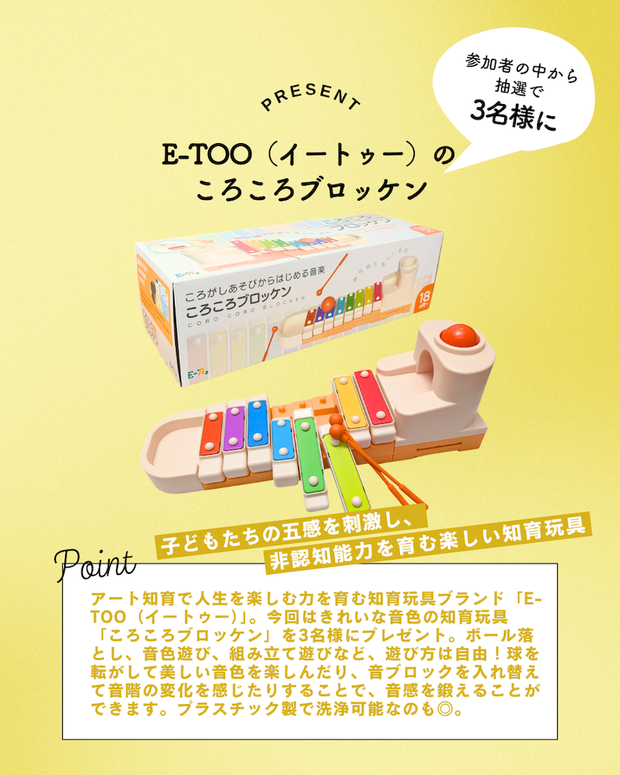 今回参加していただいた方の中から抽選で、豪華プレゼントが当たるチャンスも。知育玩具ブランド・E-TOO(イートゥー)の「ころころブロッケン」を3名様にプレゼントいたします。ぜひこの機会をお見逃しなく♡
