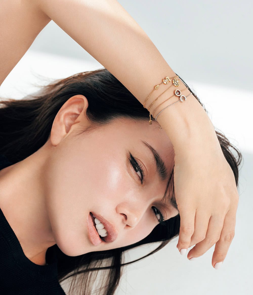 ブレスレット右から『C』〈WG〉¥323,400『O』〈BG×Dia〉¥404,800ともに「ココ クラッシュ」『カメリア』〈YG×Dia〉¥501,600「カメリア コレクション」『No5』〈YG×Dia〉¥605,000「コレクション No5」(すべてシャネル/シャネル カスタマーケア センター)トップス¥15,400(トゥ)