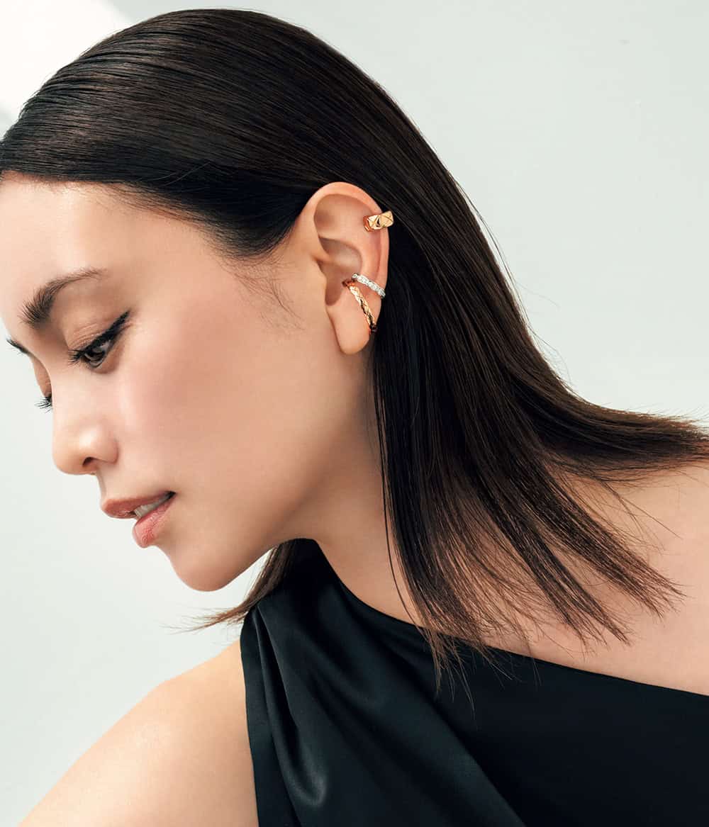 「意志を感じるシャープな直線ラインとエレガントなホワイトゴールドダイヤがMIX、憧れの女性像を体現したようなイヤカフ。どんな組み合わせでも、自分自身のスタイルを主張できるからこそ、大胆な片耳使いで」(モデル・蛯原さん)