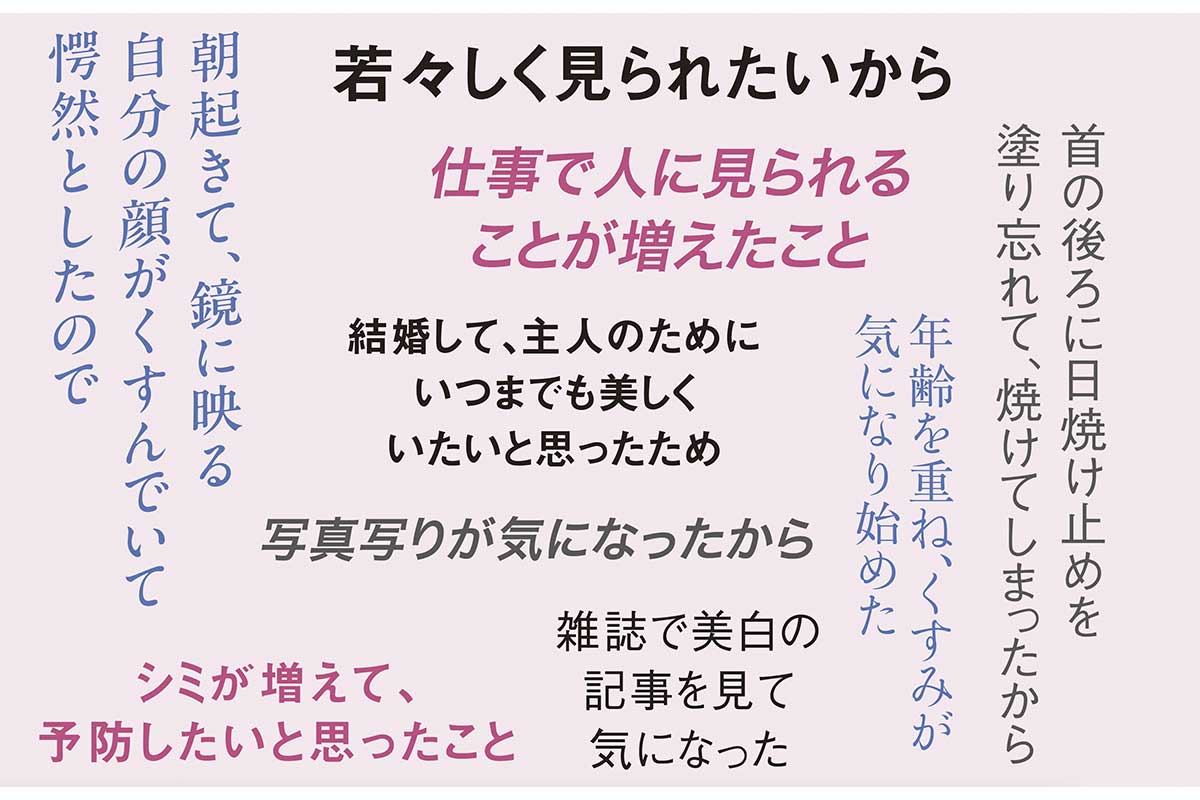 きっかけは「首の後ろを焼いた」「鏡を見て愕然」など、“目に見える実感”が強い引き金に。一方で、外仕事など環境変化や日常生活で必要性を感じた例も。また「夫のために美しくいたい」といった人生の転機が背中を押し、美白志向がより強まっていることがわかりました。