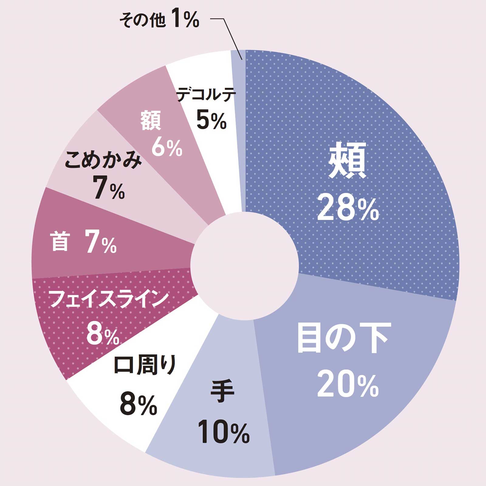 最も気になる部位は頰、次いで目の下。シミ・くすみが出やすく、顔印象を左右する“光の中心”だからこそ票が集中。手・首にも票が伸び、美白意識は全身へ。口周りやフェイスラインも上位で、大人の清潔感の底上げを求めている人々が多いです。