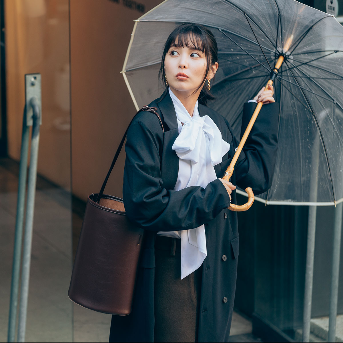 天気が不安定な日は、黒や紺のジャケットが頼れる存在。きちんと見えるうえ、雨の跳ね返り汚れも気になりにくいのがうれしいポイントです。ブラウンのボトムス合わせで落ち着いた配色にまとめつつ、存在感のあるボウタイブラウスで華やぎを添えて。