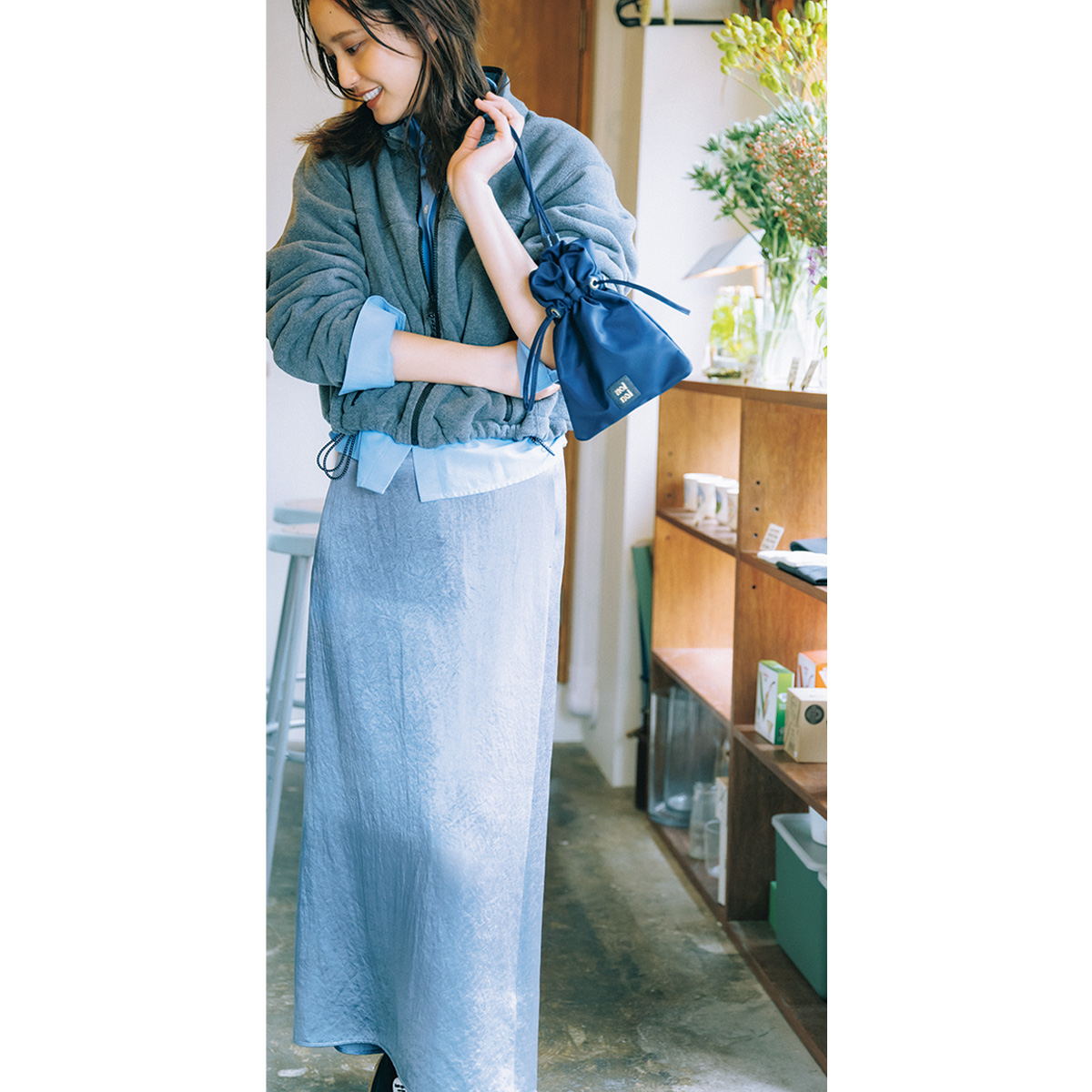特別感のあるサテンスカートをデイリーに楽しむなら、フリースブルゾンを合わせるのも◎。ツヤのある素材とカジュアルなアウターの対比で、肩肘張らない着こなしに。ブルーのシャツを重ねて色のトーンをつなげれば、軽やかな春スタイルが完成します。