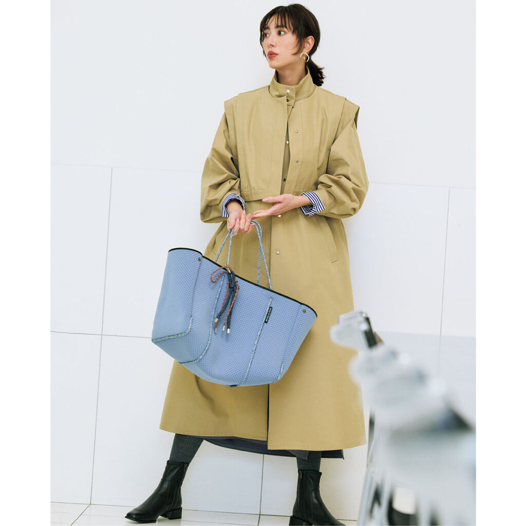 短丈ベストとコートがセットになったレイヤードアウターは、着こなしの幅が広がる優秀アイテム。ベージュ系のコートは定番だからこそ、ブルーのバッグを差し色にして配色に変化をつけるのが洒落感アップの秘訣。さらにストライプシャツの袖をまくってのぞかせれば、シンプルな装いにもほどよいアクセントが生まれます。