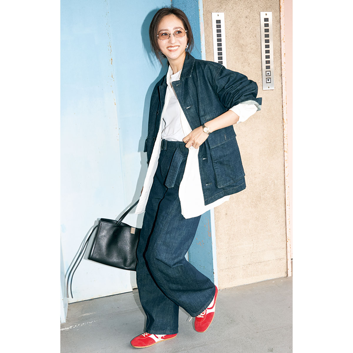 やっぱり春はデニムジャケットが気分。セットアップで着こなせば、カジュアルながら大人っぽい印象に整います。白シャツを忍ばせてきちんと感をキープさせるのが、大人らしく着るポイント。仕上げに赤スニーカーを差して小粋なアクセントを添えると、オシャレ上級者のオーラが漂います。