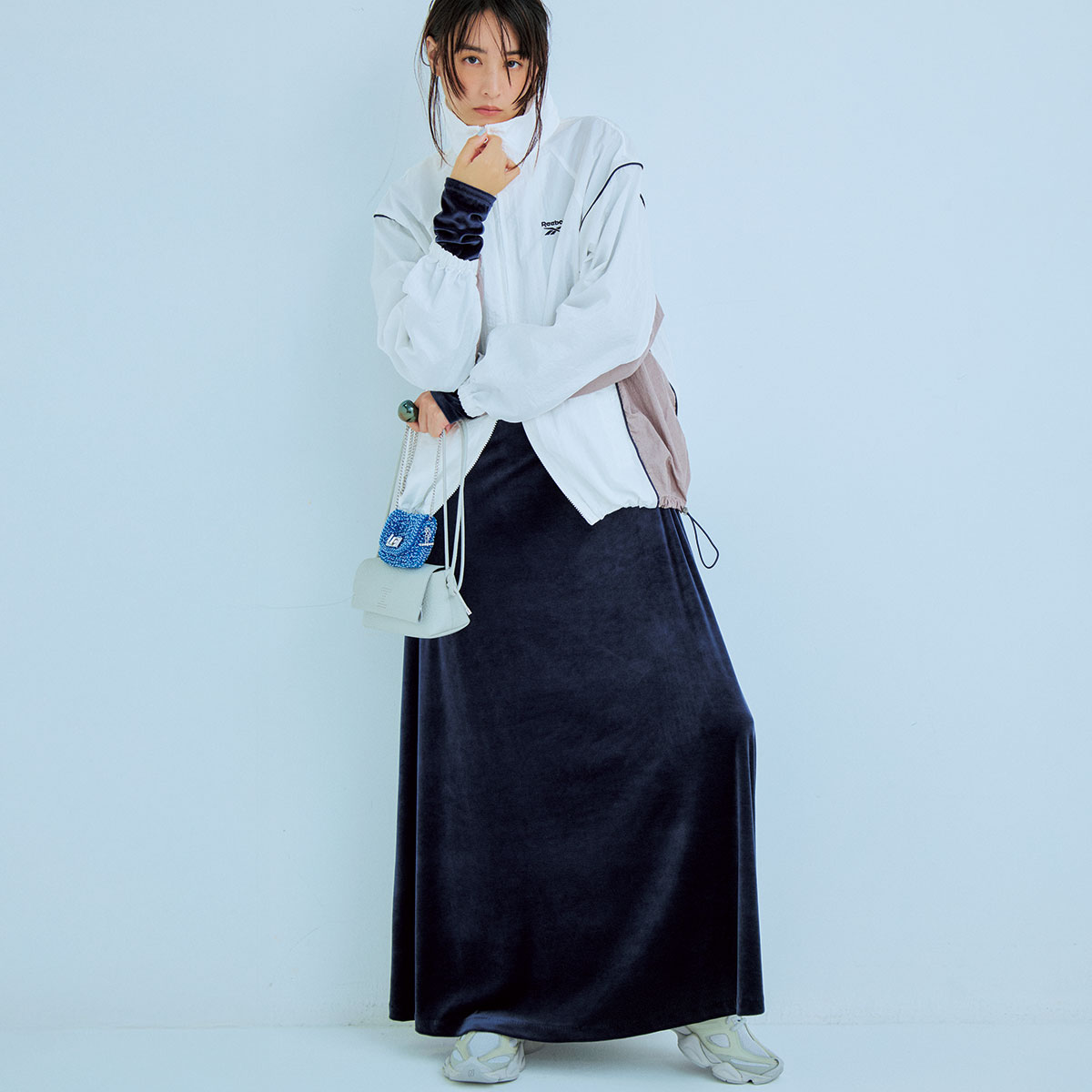 スポーティな印象のブルゾンも、白を選べばキレイめ派でも取り入れやすい一枚に。重厚なベロアワンピースの上から羽織ることで素材のコントラストが生まれ、グッと今どきの着こなしに。小ぶりのバッグやスニーカーで軽やかさを添えれば、ほどよく肩の力が抜けた春コーデが完成。