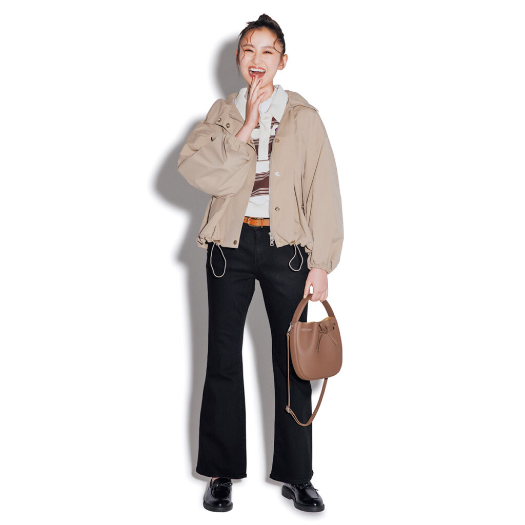 ショート丈のベージュのブルゾンは、裾のドローコードを絞ればシルエットに変化が生まれ、オンオフ活躍する一枚。フレアパンツと合わせれば、スタイルアップも期待できます。ラガーポロがカジュアルに寄らないよう、下半身は黒×ローファーで知的に引き締めるのが大人らしくまとまるコツ。