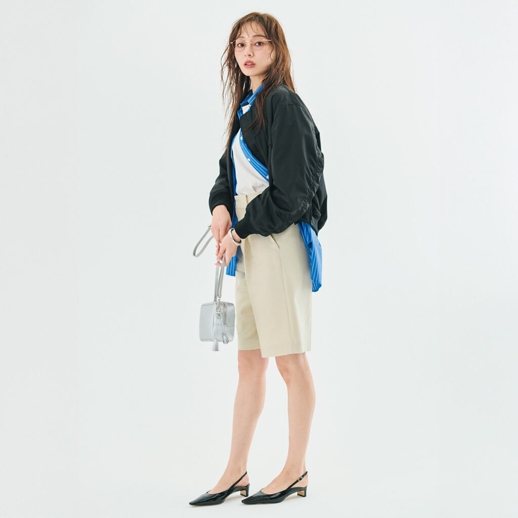 メンズライクなMA-1はハーフパンツ合わせで抜けをつくり、フレッシュな春スタイルに更新。白シャツにブルーのストライプを重ねたレイヤードが、シンプルな配色に爽やかなメリハリを添えます。パンプスでキリッと引き締めて、キレイめスポーティな着こなしに。