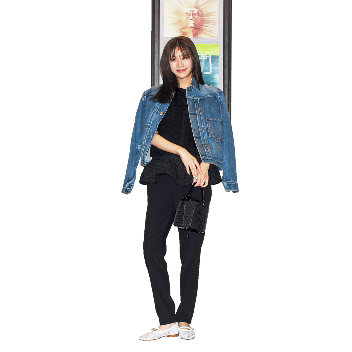 半袖カーディガン¥23,100 (ザ シンゾーン╱シンゾーン 表参道本店)パンツ¥22,000 (ル フィル ニュウマン新宿店)デニムジャケット¥50,600(ハイク╱ボウルズ)ペプラムトップス¥26,400(アトリエエディション╱サードマガジン)バッグ¥22,000 ピアス¥6,600(ともにツル バイ マリコ オイカワ)シューズ¥66,000(ネブローニ╱フラッパーズ)