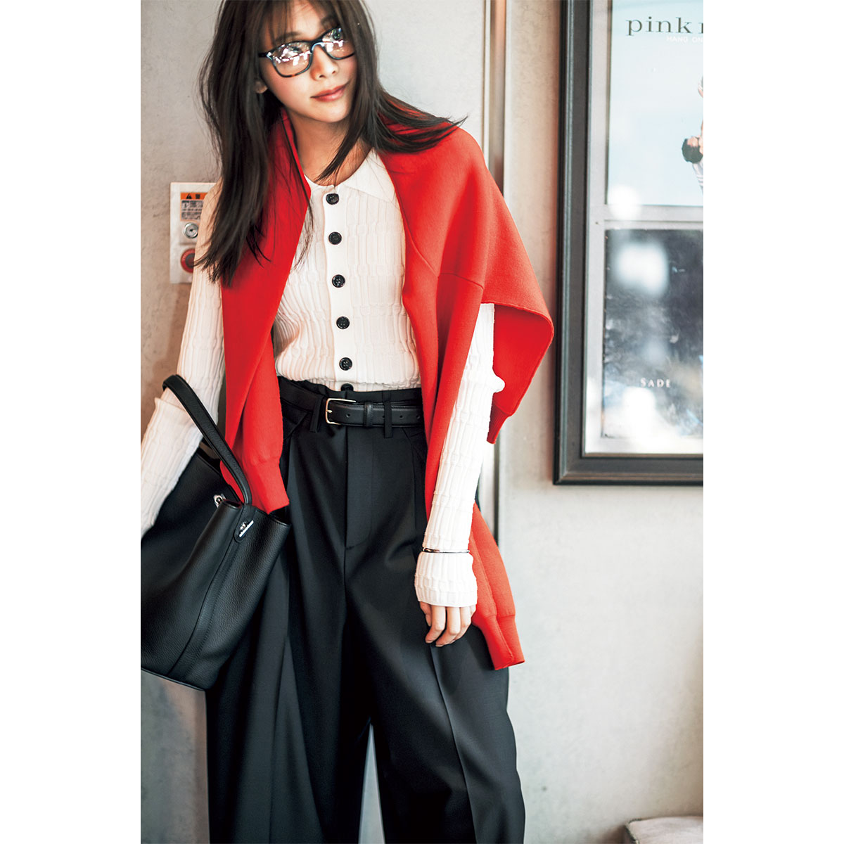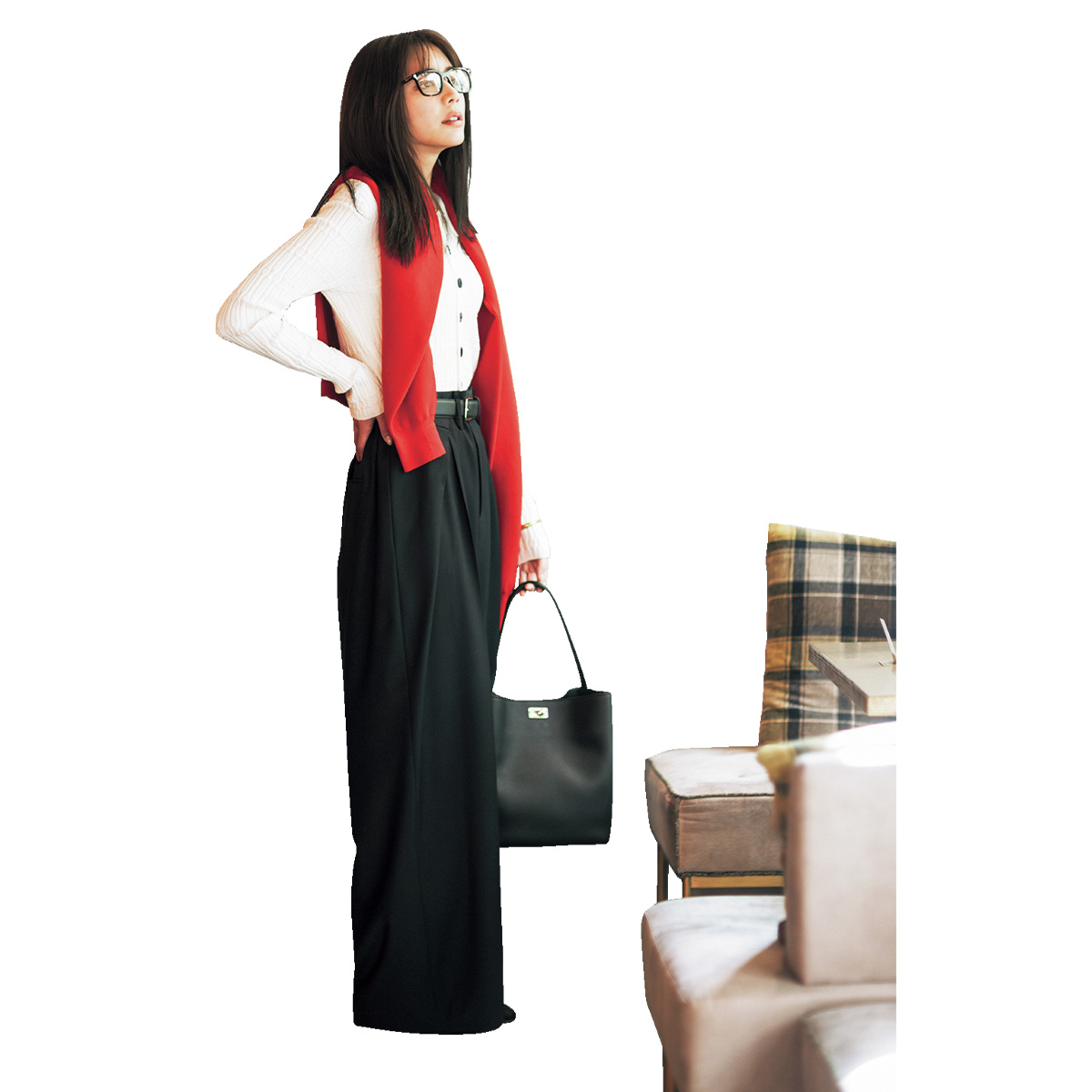 カーディガン¥15,950 (ミースロエ╱ミースロエ ルミネ新宿1店)肩にかけたニット¥29,700 (ザ シンゾーン╱シンゾーン 表参道本店)パンツ¥33,000(イウエン マトフ╱ユナイテッドアローズ 渋谷スクランブルスクエア店)ベルト¥17,600(エブール╱リトルリーグ インク)バッグ¥218,900(ミチノ・パリ╱アマン)シューズ¥35,200(ペリーコ サニー╱アマン)メガネ¥22,880(レイバン╱ルックスオティカジャパン カスタマーサービス)バングル¥19,800 (メラキ╱フラッパーズ)