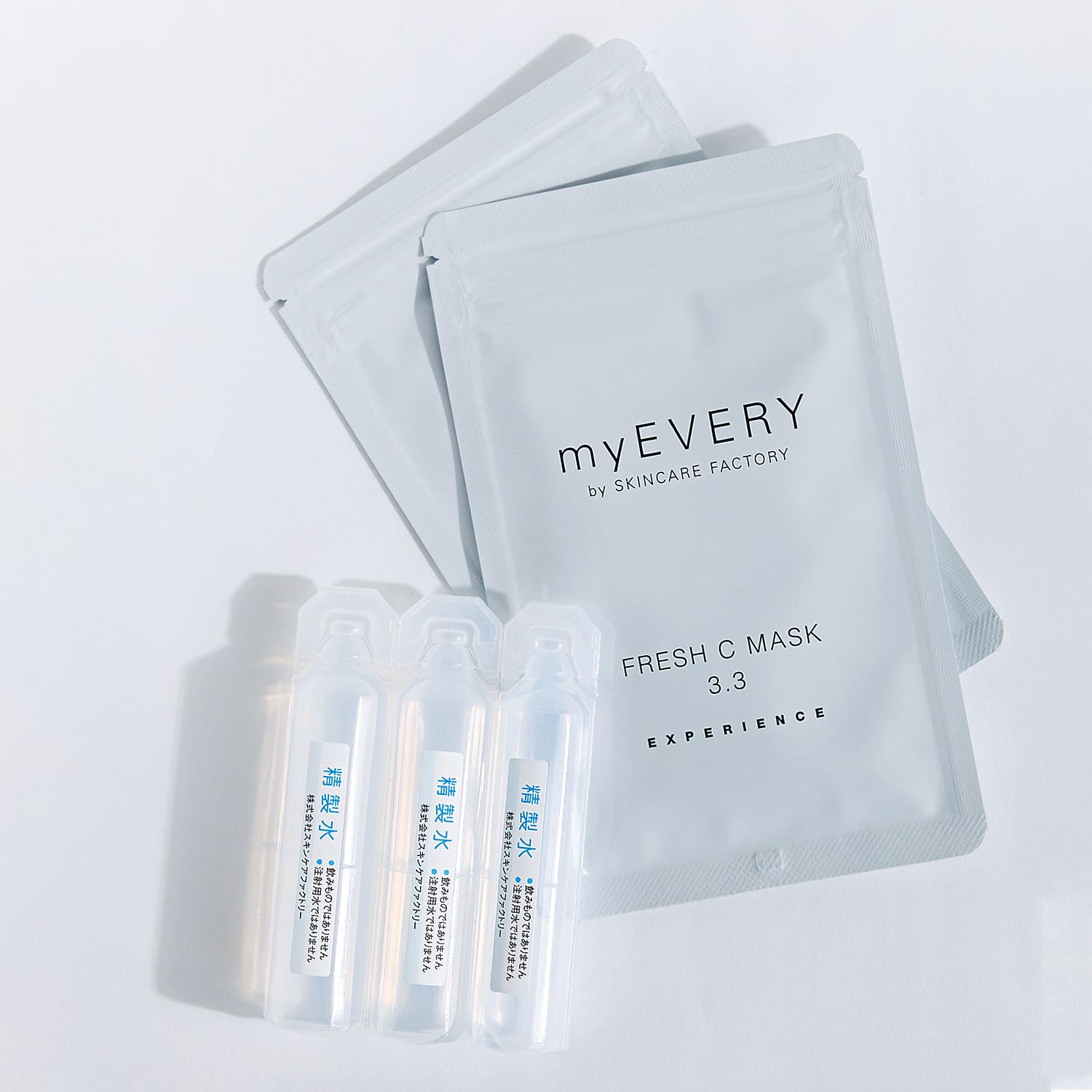 フレッシュなビタミンCをたっぷり肌に送り込み、内側から透明感ある肌へ。myEVERY フレッシュCマスク 3.3(専用希釈水付き)1セット(3枚入り)¥2,200(スキンケアファクトリー)