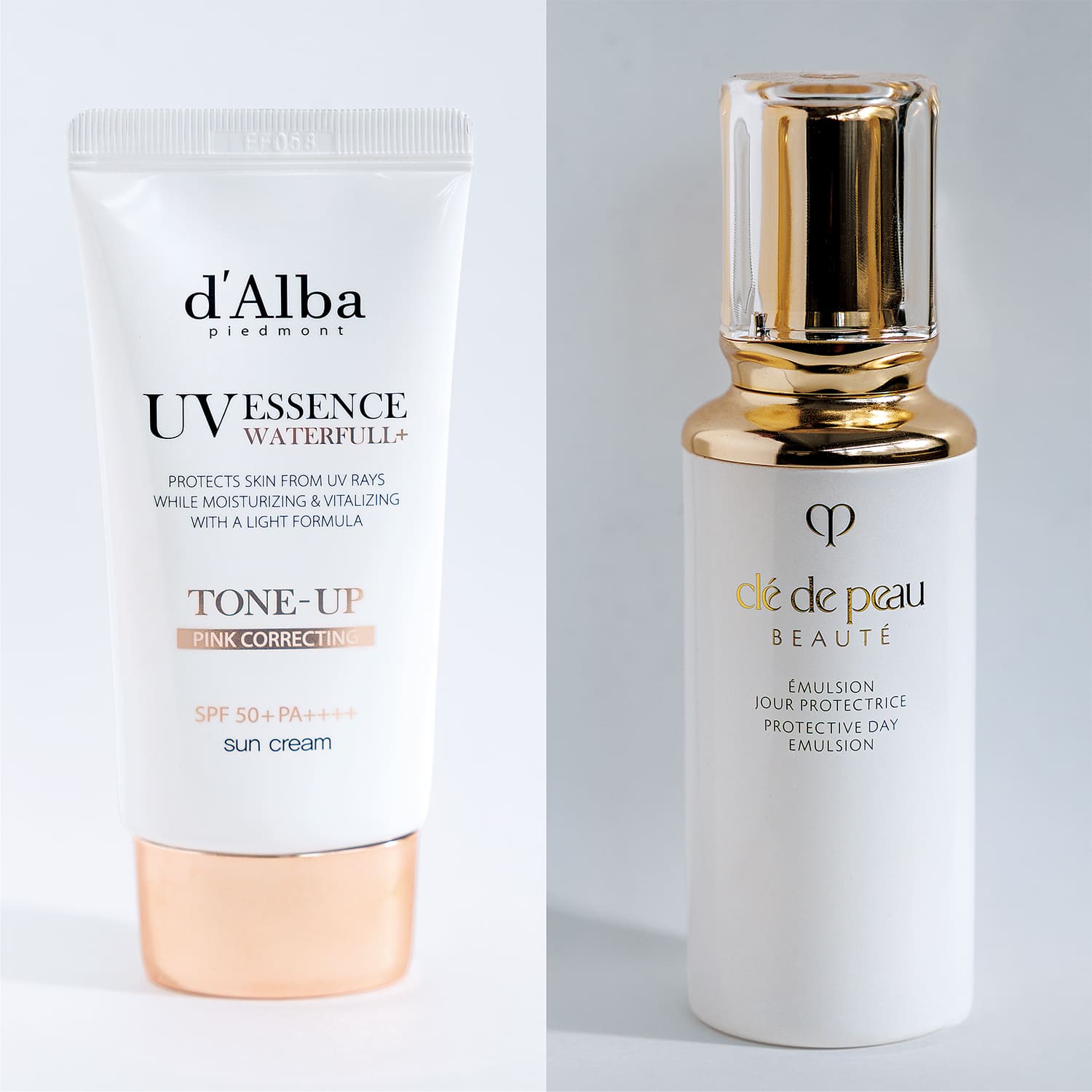 左:水のような使用感で肌色を明るくする下地。ウォータフルトーンアップサンクリーム SPF50+·PA++++ 50ml(モデル私物)右:みずみずしいうるおいを与え、紫外線や乾燥ダメージからもケア。エマルジョンプロテクトゥリス(ジュール)SPF25·PA+++ 125ml ¥15,400(クレ・ド・ポー ボーテ)
