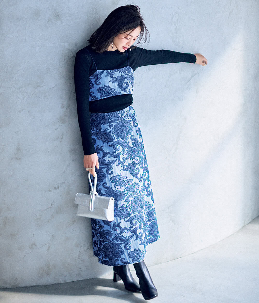 ビスチェ¥26,400スカート¥49,500(ともにガリャルダガランテ/ガリャルダガランテ 青山店)ニット¥28,600(エブール/リトルリーグ インク)バッグ¥38,500(リンレザー)ブーツ¥28,600(ダイアナ/ダイアナ 銀座本店)ピアス¥33,000リング¥38,500(ともにリューク)
