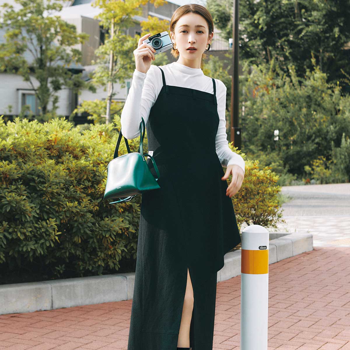 黒のキャミワンピは、フロントのスリットや立体的なディテールでさりげなく印象を更新。腰回りのフレアが着こなしに動きをつくり、深めのスリットがレディなムードを添えてくれます。インに白カットソーを重ねて、軽やかさをキープするのがカギ。
