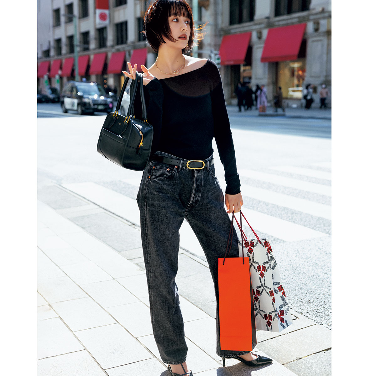 ほどよくゆるい黒デニムなら、ブラックの端正さを保ちつつ、気負いすぎない絶妙なバランスに。身体にフィットするトップスでメリハリをつけ、鎖骨をのぞかせて女性らしさを添えるのがポイント。ゴールドバックルのベルトで視線を上げれば、スタイルアップも叶います。