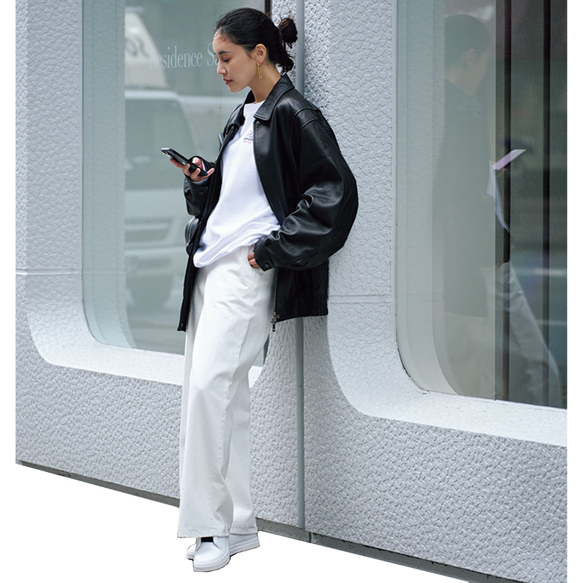 重厚感のある黒レザーブルゾンは、白T×白パンツのクリーンな配色でやわらかな雰囲気に。ゆるめのシルエットをラフに羽織ることで、ハードになりがちなレザーも今っぽい抜けが生まれます。ざっくり結んだお団子ヘアやスニーカーで肩の力を抜くのが、洒落感アップの秘訣。