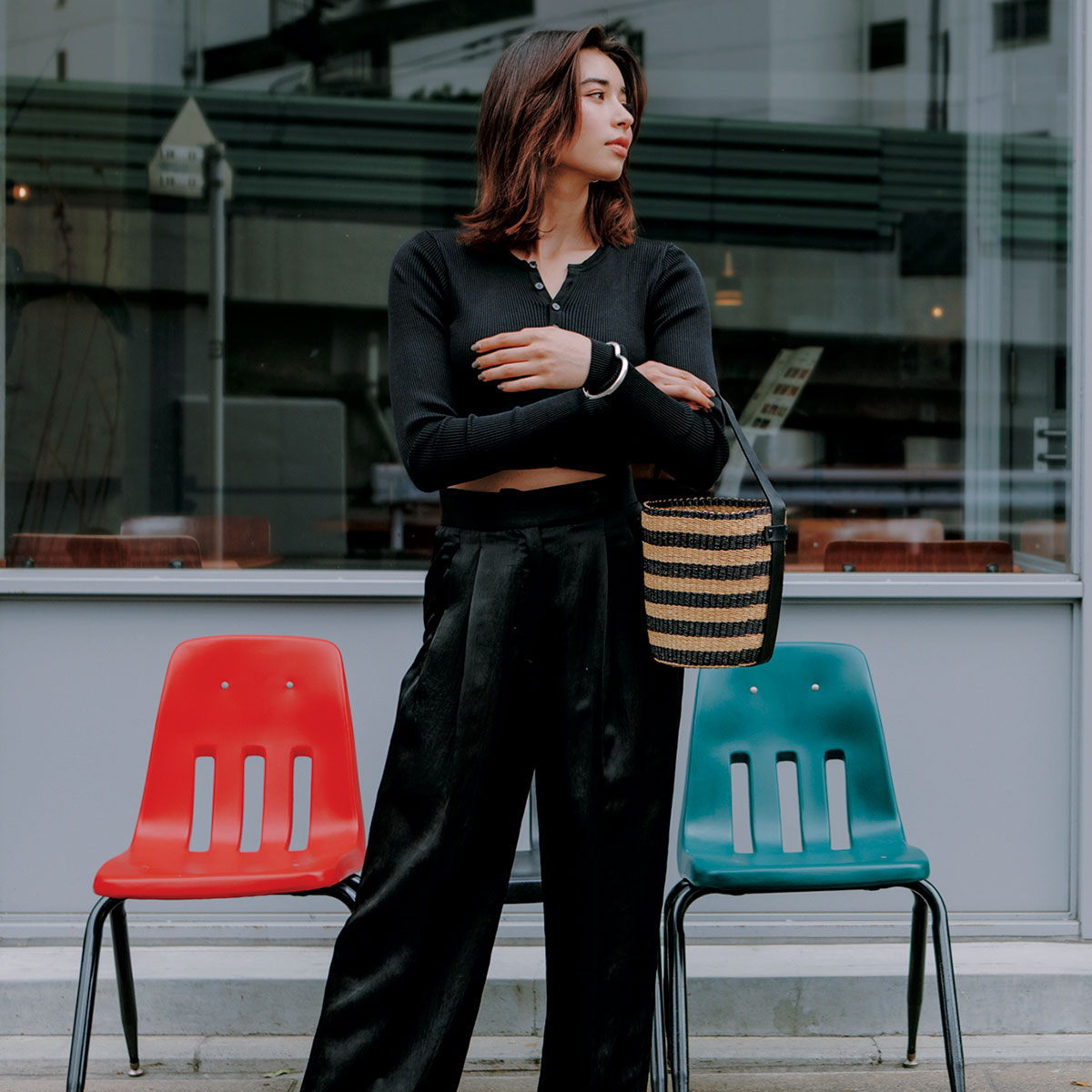 ストイックなオールブラックに肌見せやかごバッグで意外性をプラス