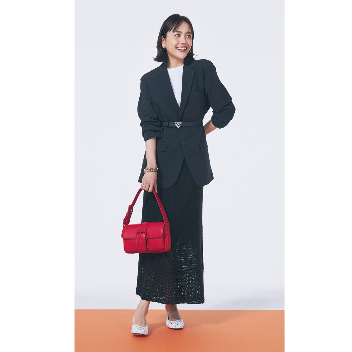 黒ジャケット×黒スカートは、きちんと感は十分だけれどややお堅い雰囲気も…。春はスカートの素材を透け感あるニットに替えて、柔らかな印象に導くのが正解です。白インナーを効かせることで、重く見えがちな配色も春らしい抜けのある着こなしに。ハートバックルのベルトや赤バッグで、遊び心を添えて。