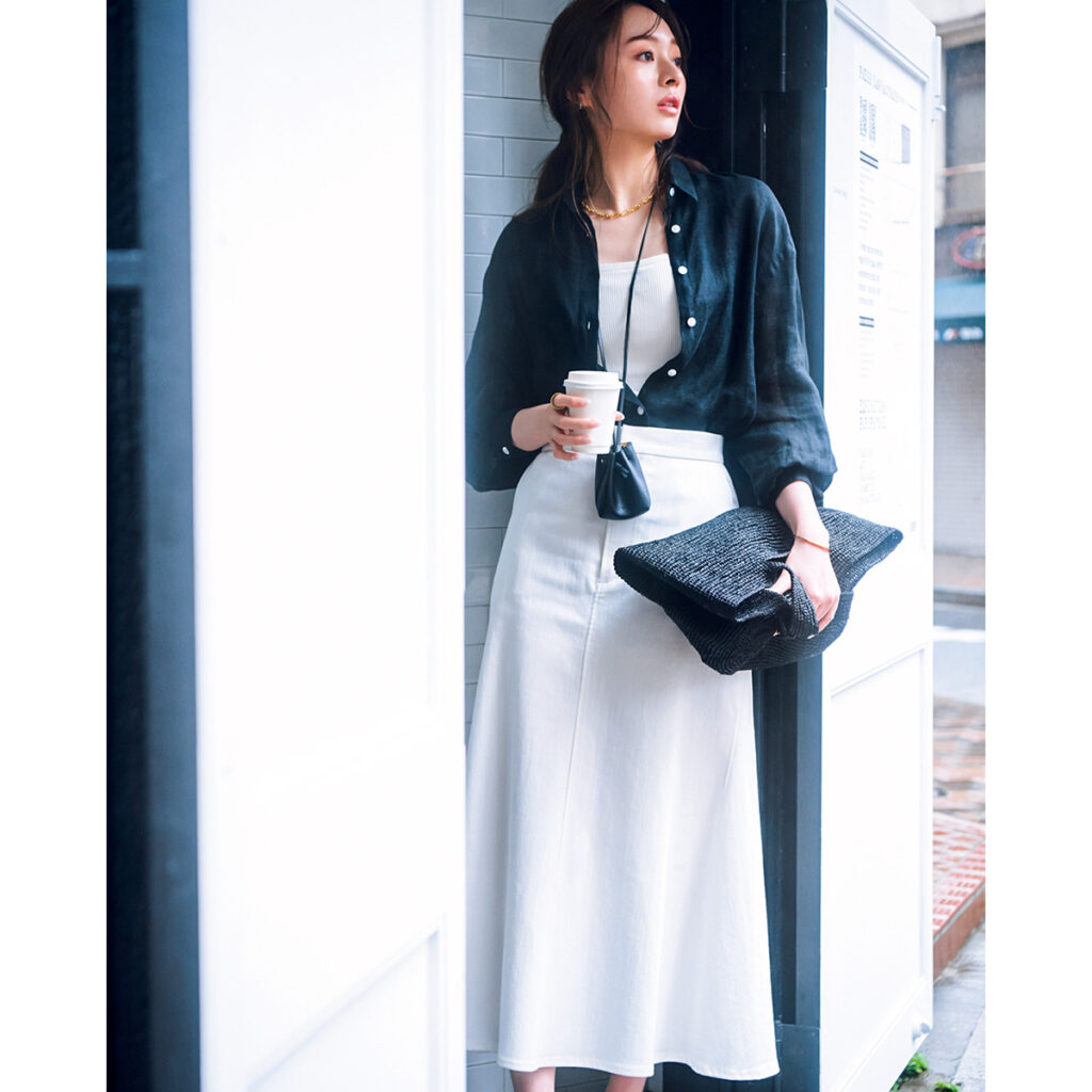 ほっこり見えがちな白スカートは、黒シャツを羽織ってほどよく引き締めて。キリッとした黒シャツをあえてゆるめに着ることで、無難に見えがちなモノトーンにこなれ感を生み出します。白多めの配色ならクリーンな印象が際立ち、春らしい好印象な装いに。