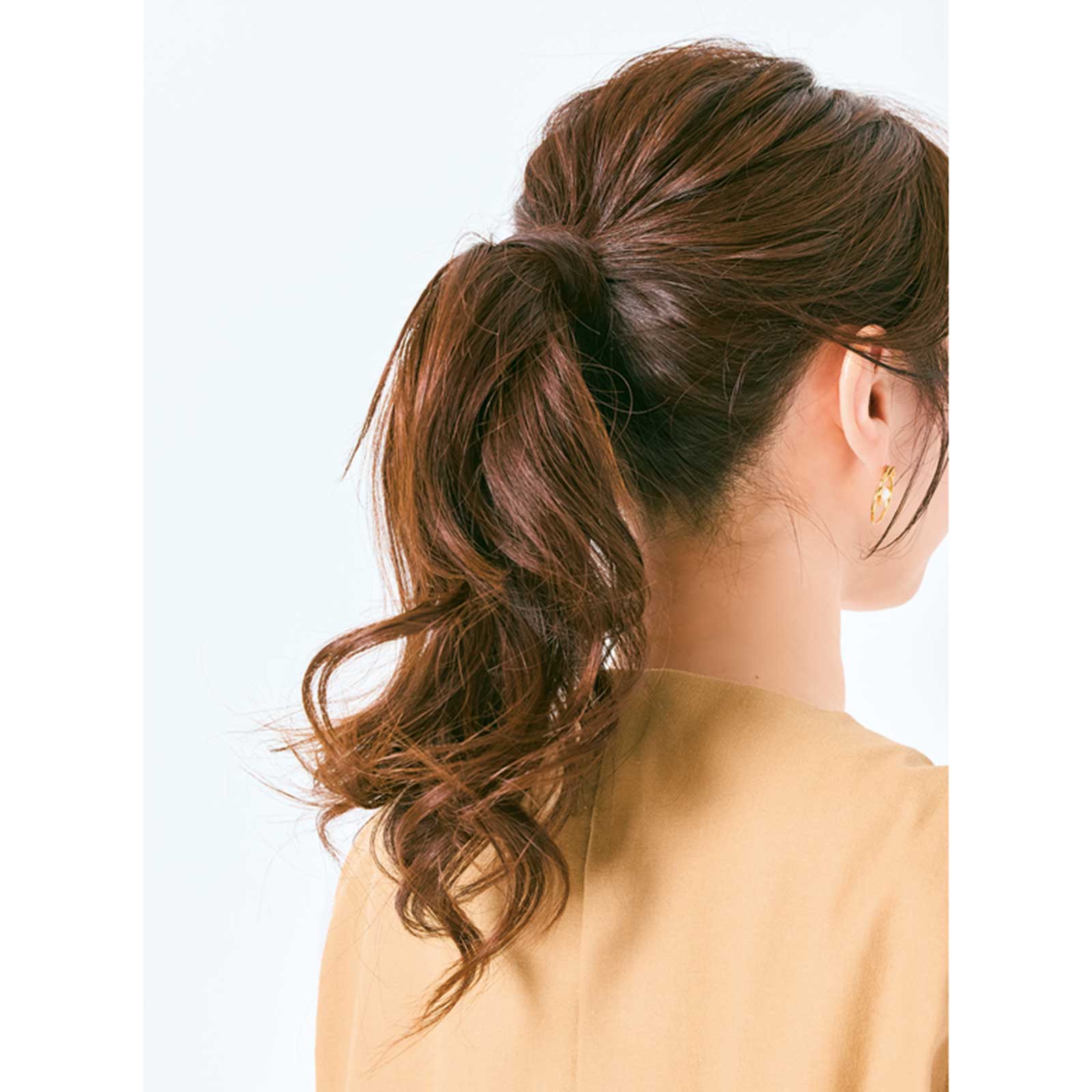 トップをふんわり仕上げるには耳上の高めで結んで髪を引き出し、立体感を出すことが大切。結んだ細い根元には毛束を巻きつけてふんわりとかさ増しするのがおすすめです。