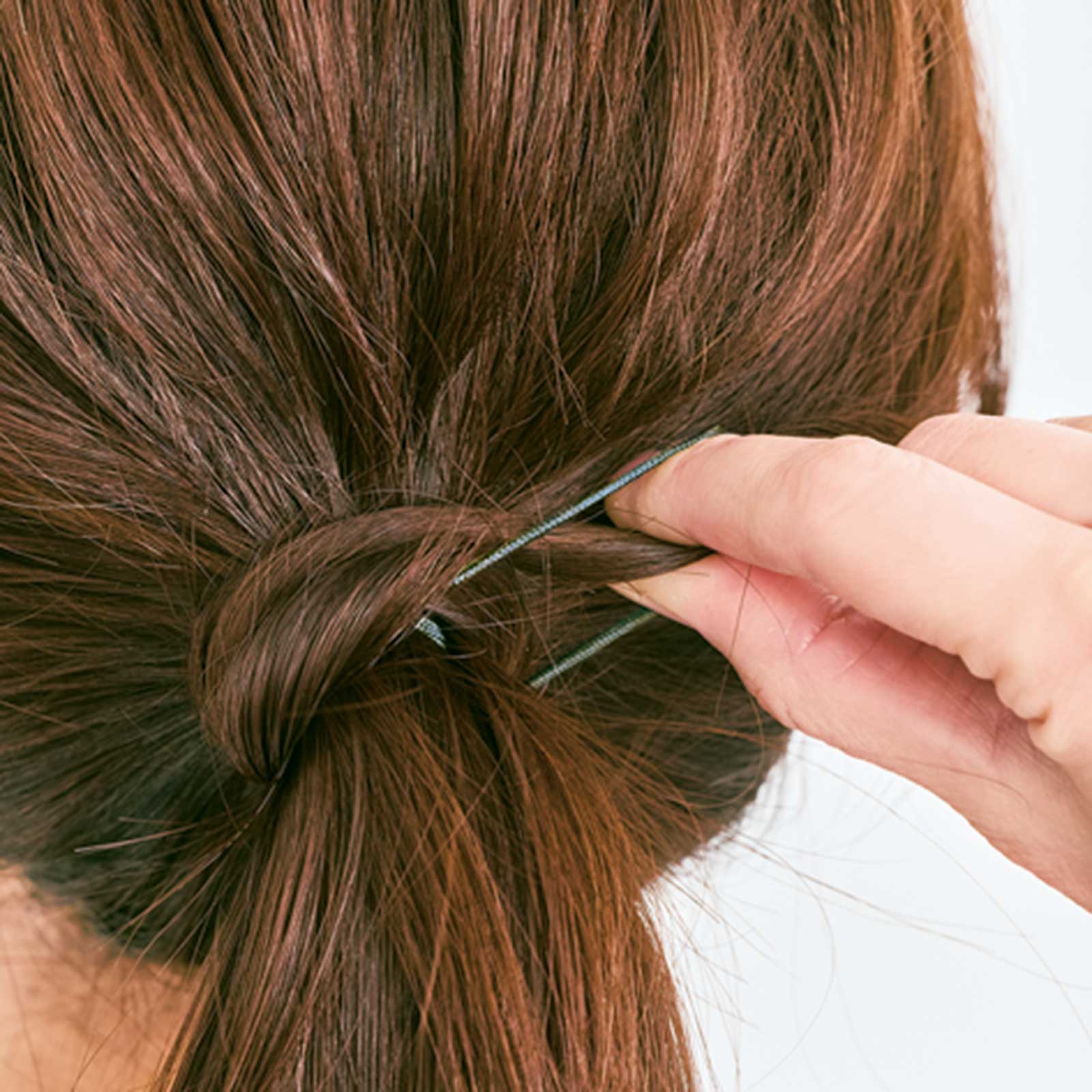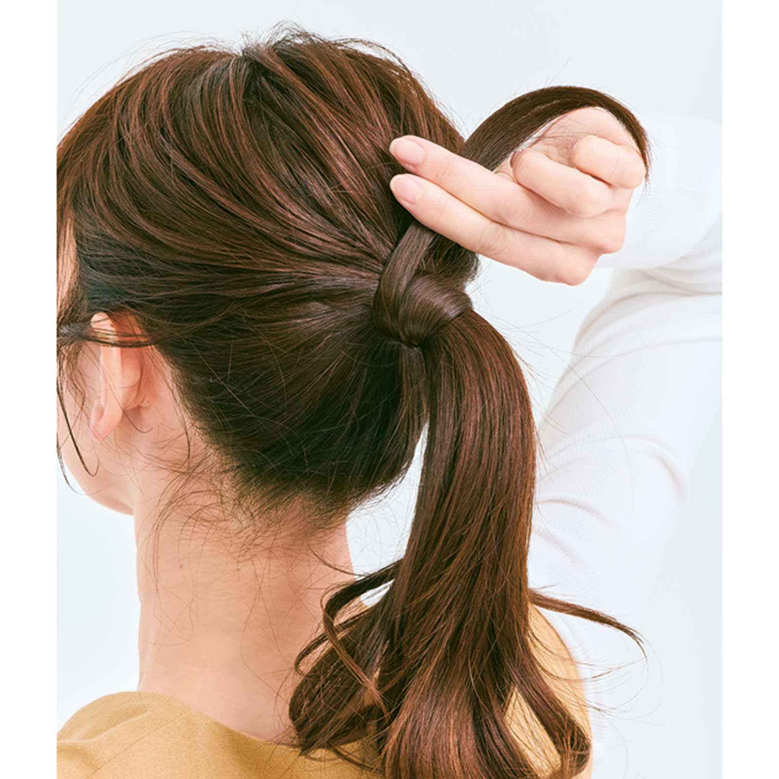 4.結んでいるゴムを引き出し、巻きつけた毛先をゴムに通して留めます。目立たない下の方の位置で通すのがコツ。