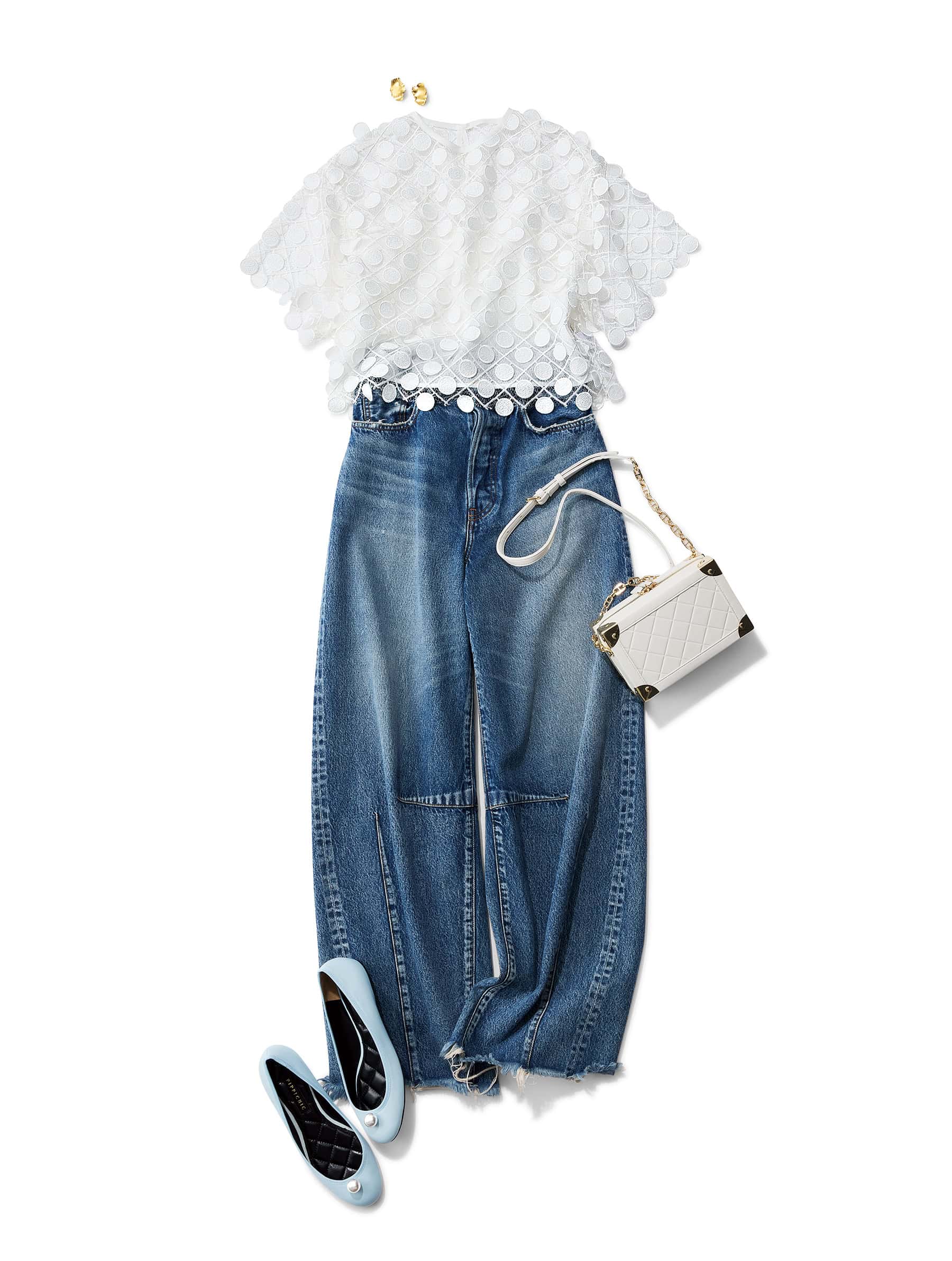 レーストップス¥29,000(シーニュ)デニムパンツ¥49,500(ニードバイ ヘリテージ/ヴェルメイユ パー イエナ 日本橋店)バッグ¥19,250(ダイアナ/ダイアナ 銀座本店)パンプス¥41,800(ピッピシック/ベイジュ)ピアス¥34,100(プリュイ/プリュイ トウキョウ)