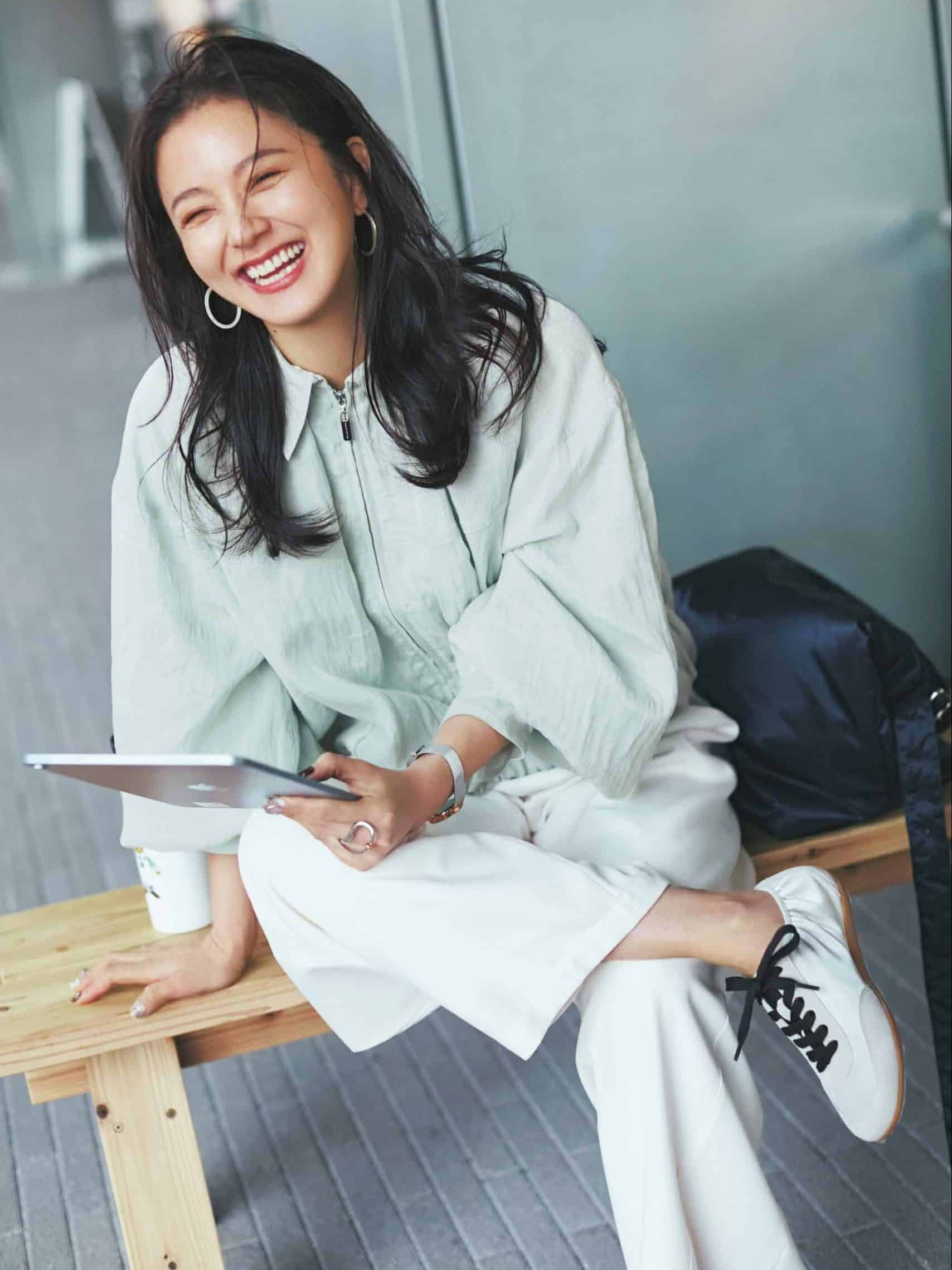ブルゾンブラウス¥18,920(メゾンスペシャル 青山店)パンツ¥22,000(カデュネ)バッグ¥28,600(エス/sense)スニーカー¥17,600(オデット エ オディール/オデット エ オディール 新宿店)ピアス¥42,900(ete bijoux)時計¥23,100(Jouete)リング¥13,750(ソワリー)