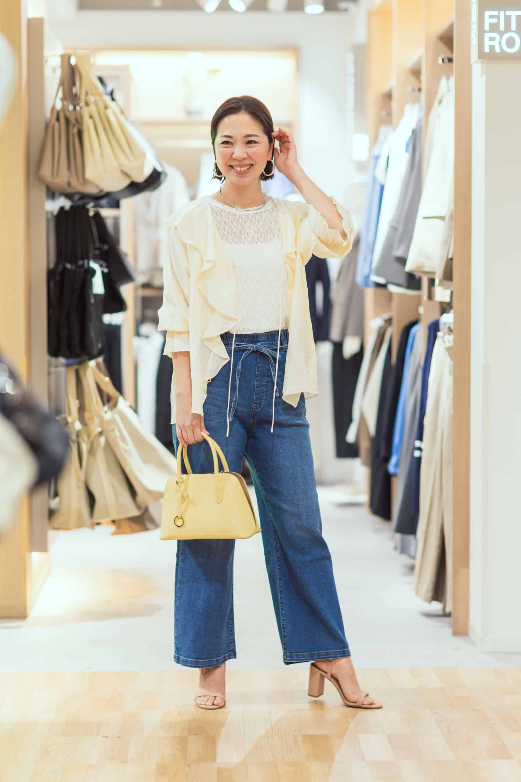 「顔まわりが華やか見えする大きなフリルカラーのブラウスは、軽やかな羽織としても活躍するアイテムです。デニムのように見えるパンツは実は綿麻素材で、やわらかな穿き心地に感動。インナーにはレーストップスを合わせてさり気ない抜け感をプラスしました。春らしいイエローバッグで引き締め、大人の余裕を感じさせるカジュアルスタイルを楽しめそう」