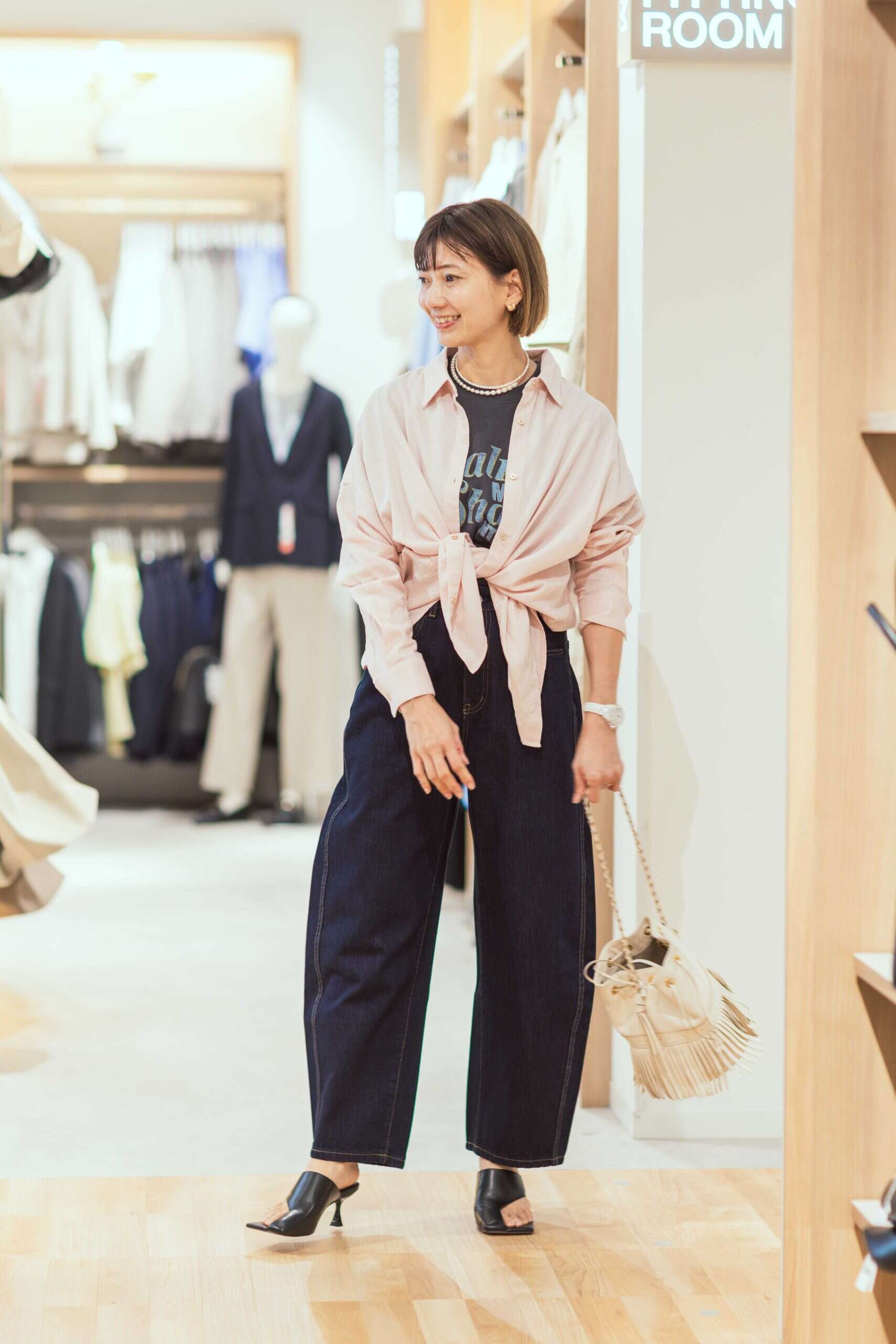「春アウターにちょうどよいリネン50%混のフレンチシャツは、顔映りを明るくしてくれるピンク色をチョイス。こちらのシャツは、カラー・柄のバリエーションが豊富で、着丈もLONGとSHORTがあり用途に合わせて自由に選べます。オーバーサイズなので羽織るだけでこなれ感が出て、デニム&Tシャツのカジュアル感を程よく抑えてくれる優秀アイテムです」