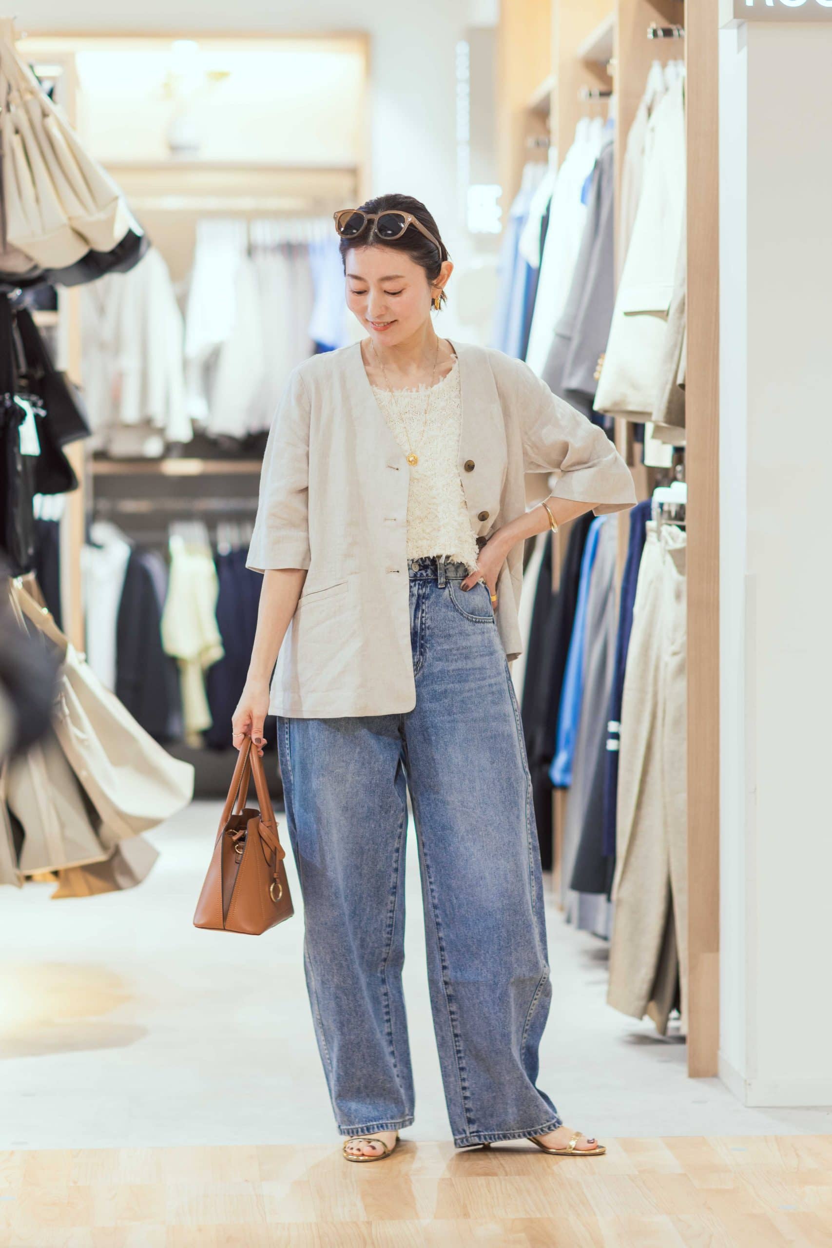 「リネン混の軽やかな仕立ての五分袖ジャケットは、カジュアルにも通勤にも活躍する一枚。通気性がよく、暑い日でも涼しく快適に着られるのが魅力です。ノーカラーのすっきりとしたデザインで、カーディガン感覚でさらっと羽織れるのも嬉しいポイント。インナーにはテープヤーンをミックスしたビスチェを合わせて今どきの抜け感をプラス。バレルシルエットのデニムと合わせて、きれいめカジュアルに仕上げました」