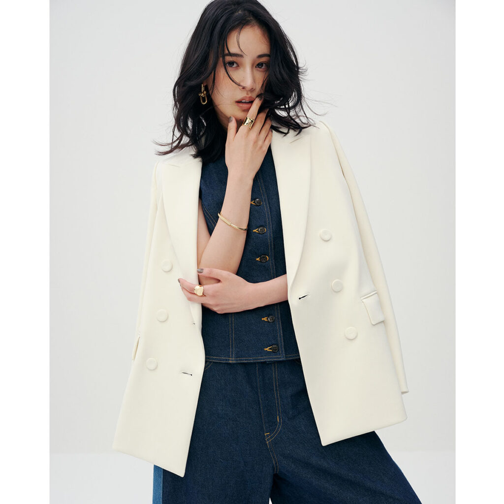 リング[左手]「エルサ・ペレッティ ボーン リング」〈YG〉¥907,500リング[右手]「エルサ・ペレッティ スプリット リング」〈YG〉¥880,000ピアス「ティファニー ハードウェア」〈YG〉¥1,342,000バングル「ティファニー ロック」〈YG〉¥1,232,000(すべてティファニー/ティファニー・アンド・カンパニー・ジャパン・インク)ジャケット¥154,000〈エストネーション ザ ファースト〉デニムベスト¥44,000デニムパンツ¥49,500〈ともにユナス〉(すべてエストネーション)
