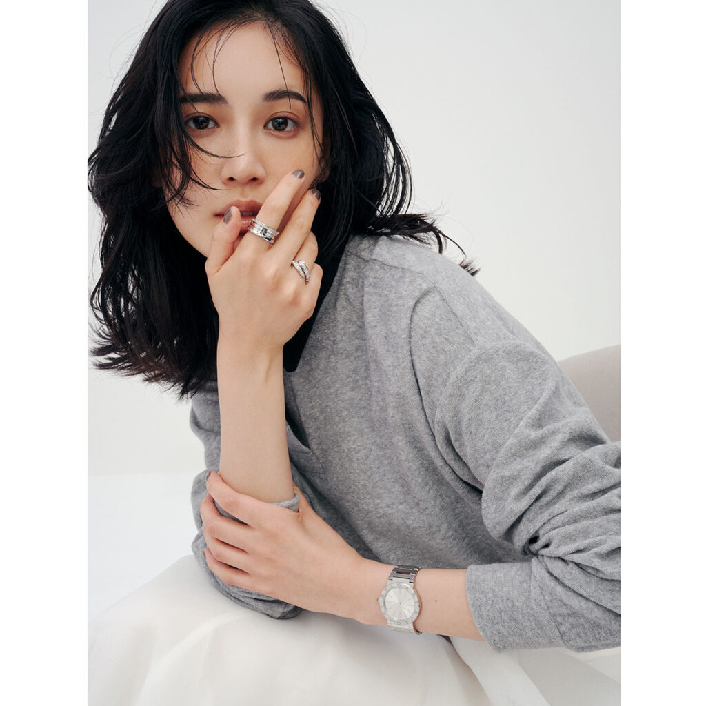 時計「ブルガリ・ブルガリ」〈SS×クォーツ〉¥616,000リング[人差し指]「ビー・ゼロワン」〈WG×D〉¥841,500リング[薬指]「セルペンティ ヴァイパー」〈WG×D〉¥1,771,000(すべてブルガリ/ブルガリ・ジャパン)ポロニット¥19,800(エス/合同会社 sense)スカート¥31,500(シーニュ)