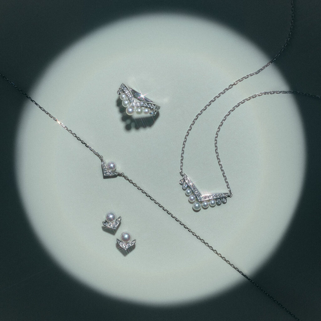 「ジョゼフィーヌ」コレクション〈WG×D×アコヤパール〉右エグレット ペンダント¥969,100エグレット リング¥1,068,100中エグレット ペンダント¥521,400エグレット イヤリング¥639,100(すべてショーメ)